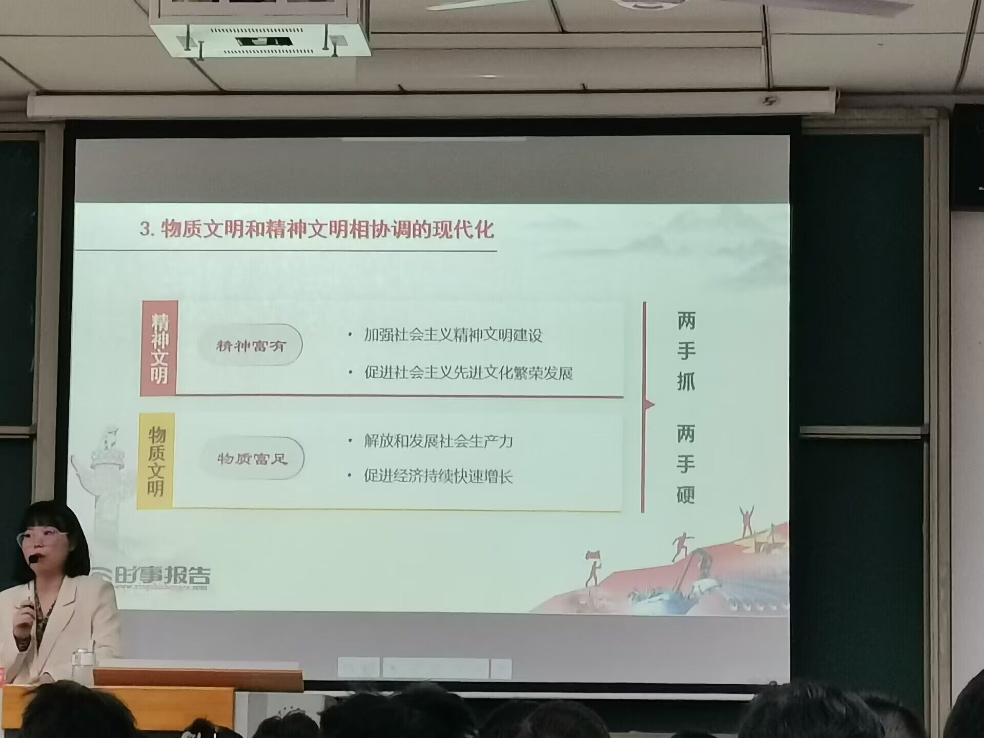 本次听评课活动由李清泉老师讲授《形势与政策(4)》第二讲“走好中国式现代化之路”的相关内容。李清泉老师以“中国式现代化是什么”进行问题导入引发学生思考,通过“接续奋斗,追求千年梦想”“立足国情,开辟全新道路”“凝心聚力,推进复兴伟业”三方面内容进行理论的讲解。在讲课过程中,李清泉老师运用精巧的教学设计重点帮助学生理解中国式现代化的基本特征和本质要求。