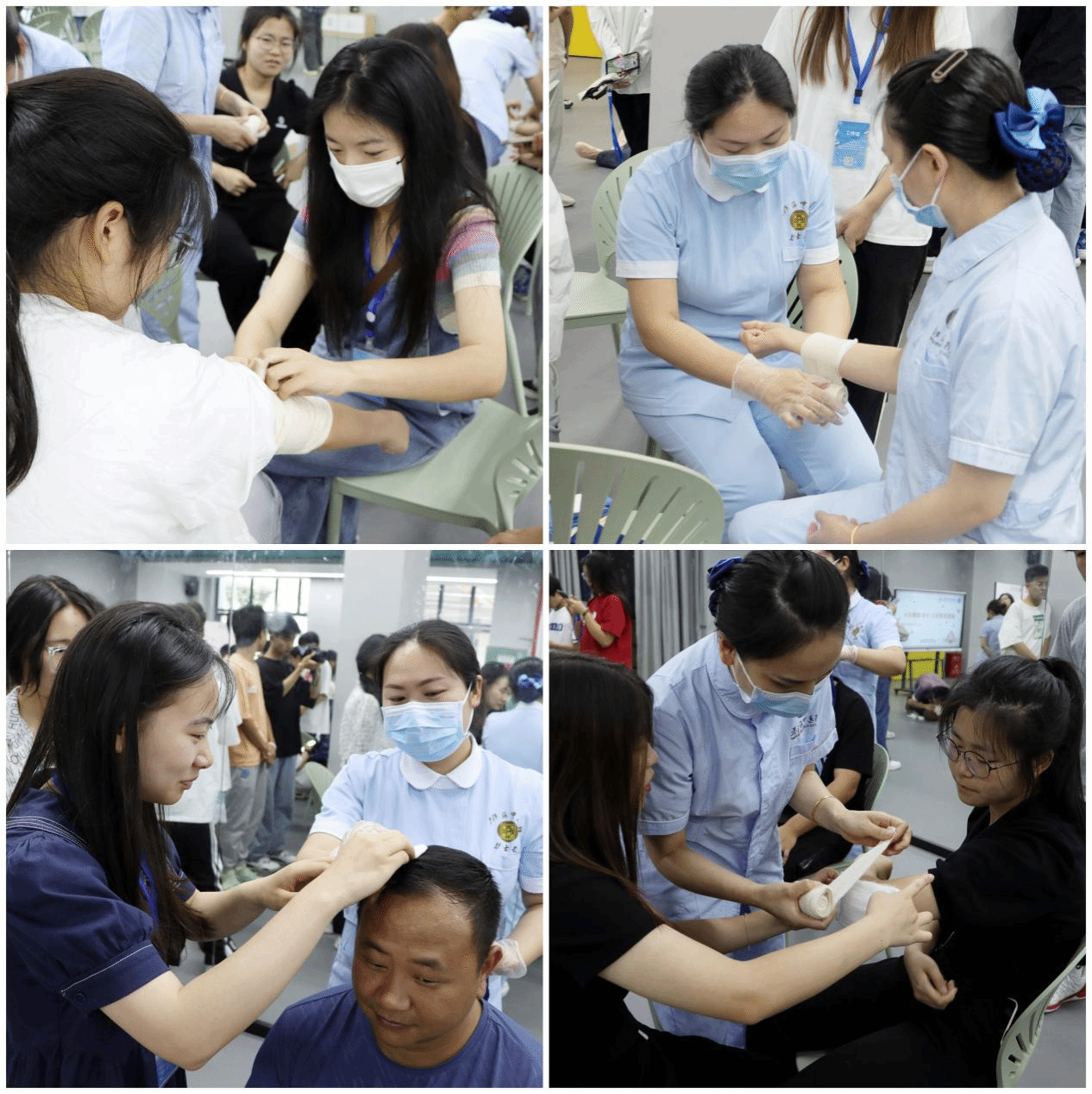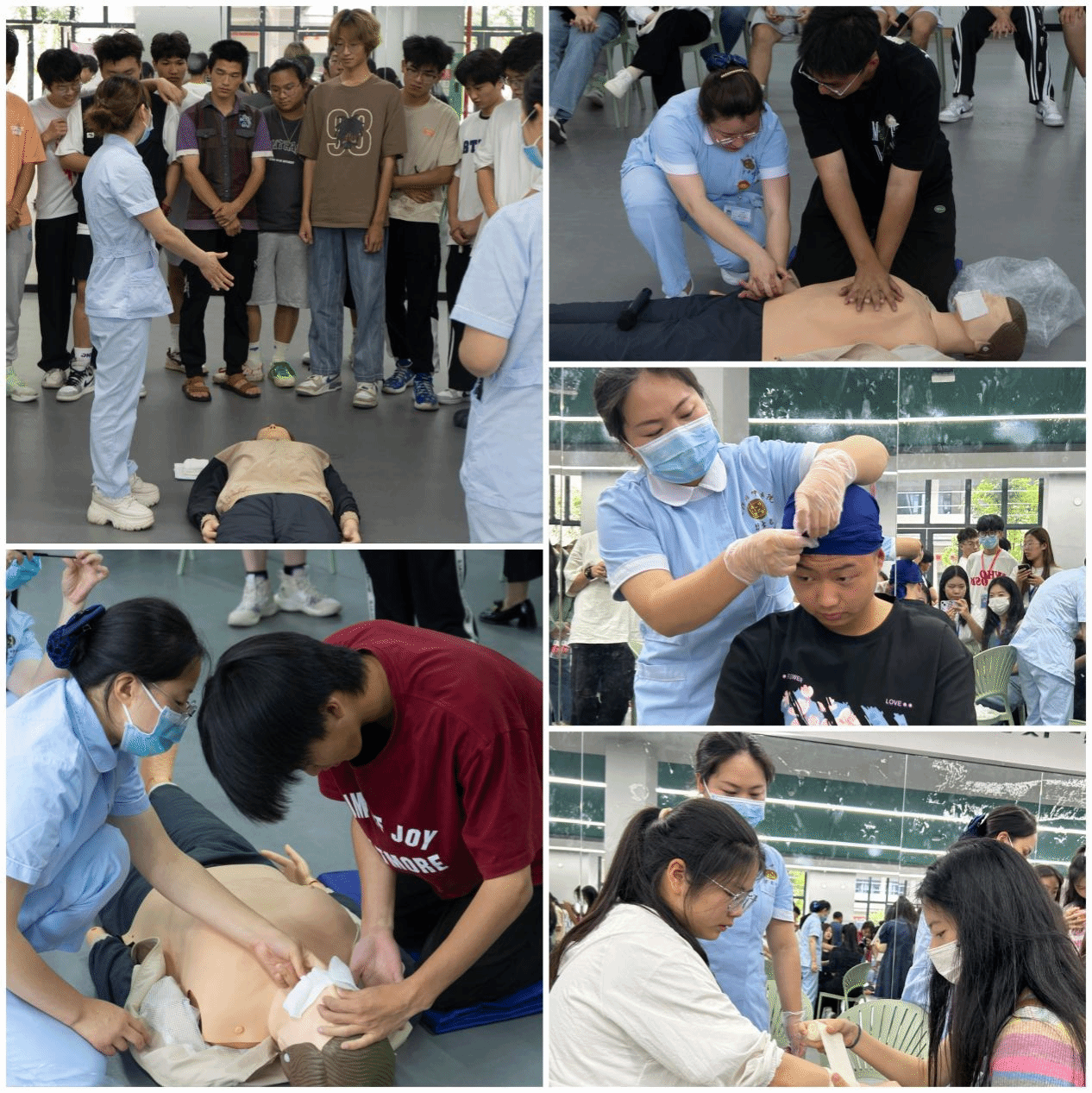 在随后的实操环节,同学们分组上手训练,同学们在每组带教护士的指导下开始实践。“不要靠单手手臂力量去做心肺复苏,要充分利用全身力量去按压。”“每分钟按压100到120下,深度5到6公分。”护士姐姐们仔细观察师生的操作,对动作不准确的师生进行了手把手的纠正指导,同时,对于大家提出的问题也进行了耐心地解答,让大家受益匪浅,护士姐姐们形象生动的解说让大家充分了解到急救的重要性和掌握急救技能的必要性。