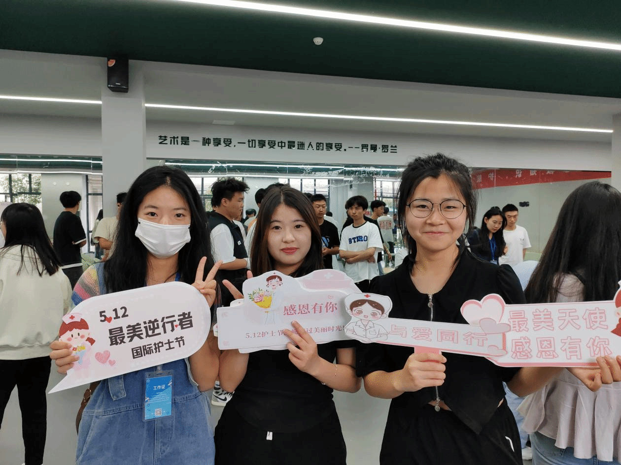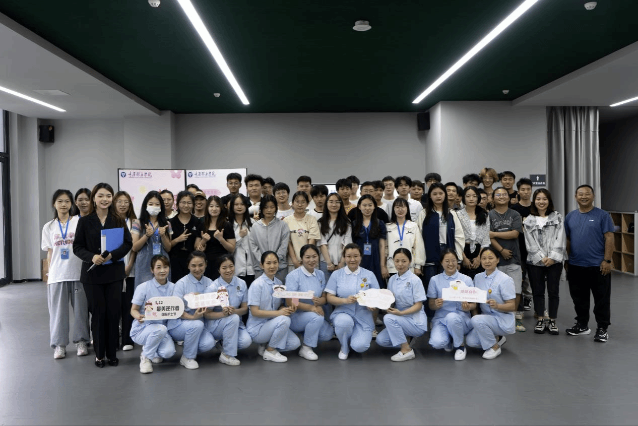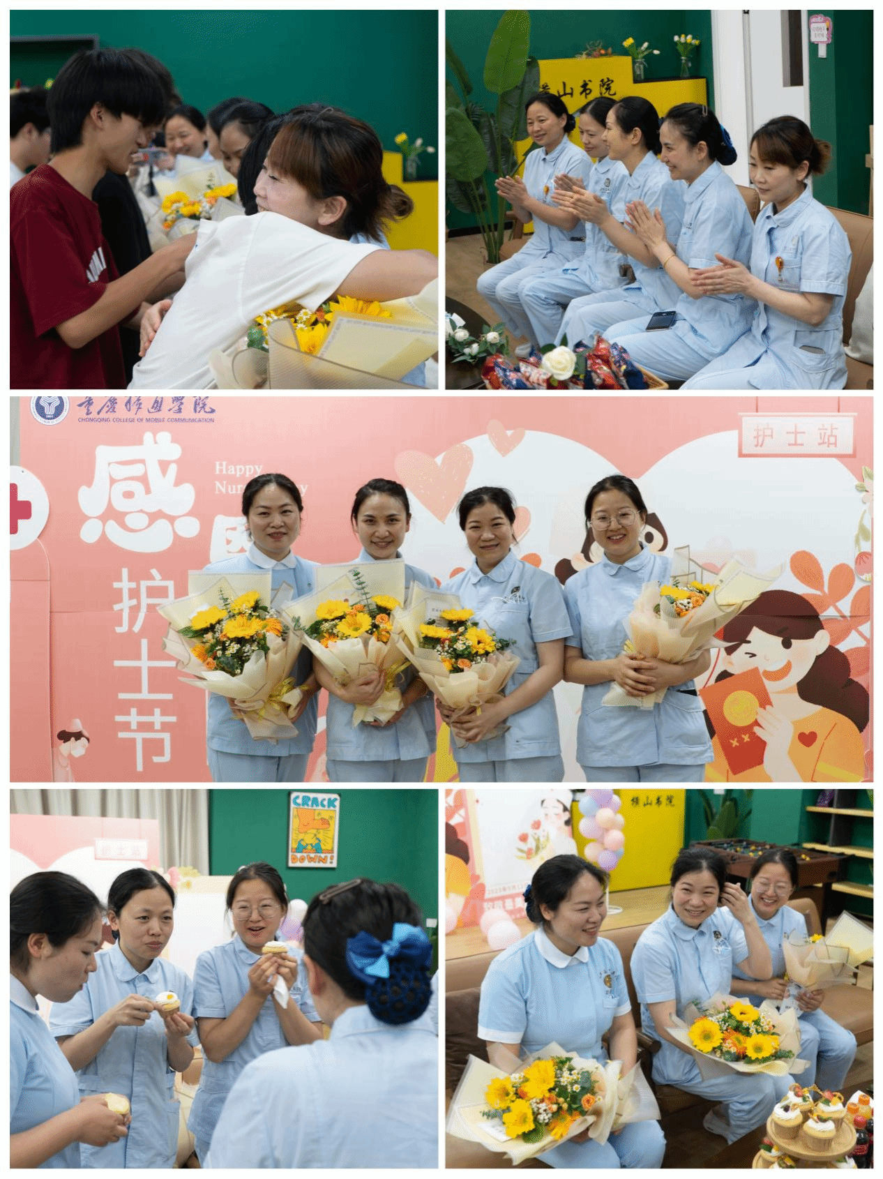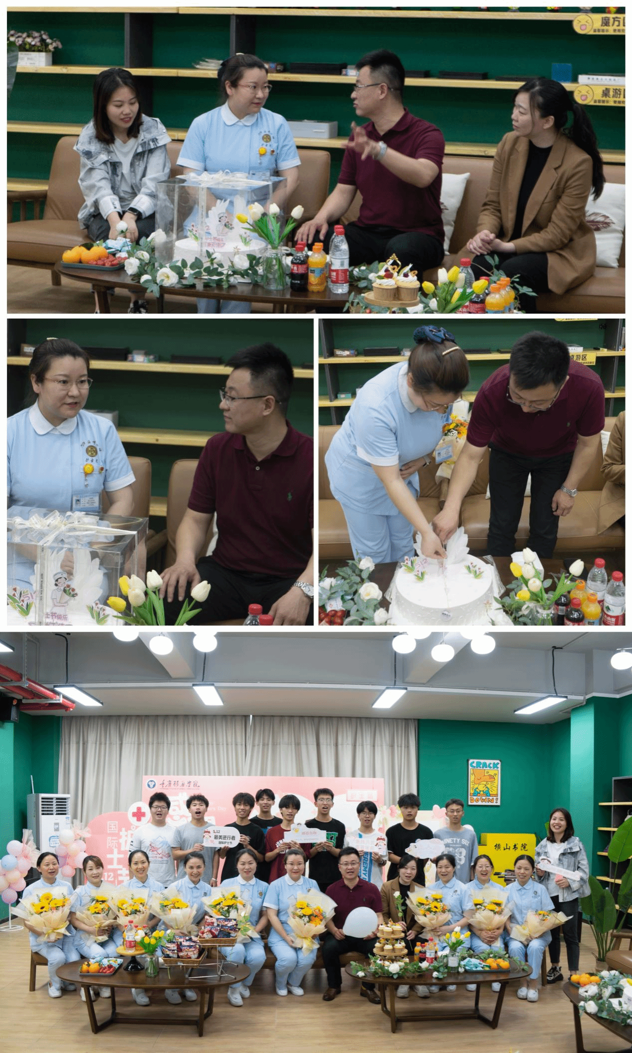 培训结束后,学生处副处长梁少锋、学生科副科长陈永书、基建后勤处综合管理办公室副主任江蓉与綦江区中医院的医护人员们热情交谈,梁处长代表校方对綦江区中医院在疫情期间对我们学校的大力支援表示感谢,同时表示希望以后有更多的合作,李主任也表示非常期待与学校后续的合作。培训当日正值“5·12”国际护士节,梁处长邀请李主任共同切开节日蛋糕,并为白衣天使们送上节日祝福。同学们为护士姐姐们送上鲜花和节日祝福,感谢她们的耐心教导和健康守护。交流会现场,綦江区中医院的医护人员们与我校师生欢心交流,拍照记录,大家的欢声笑语点燃了整个会场。