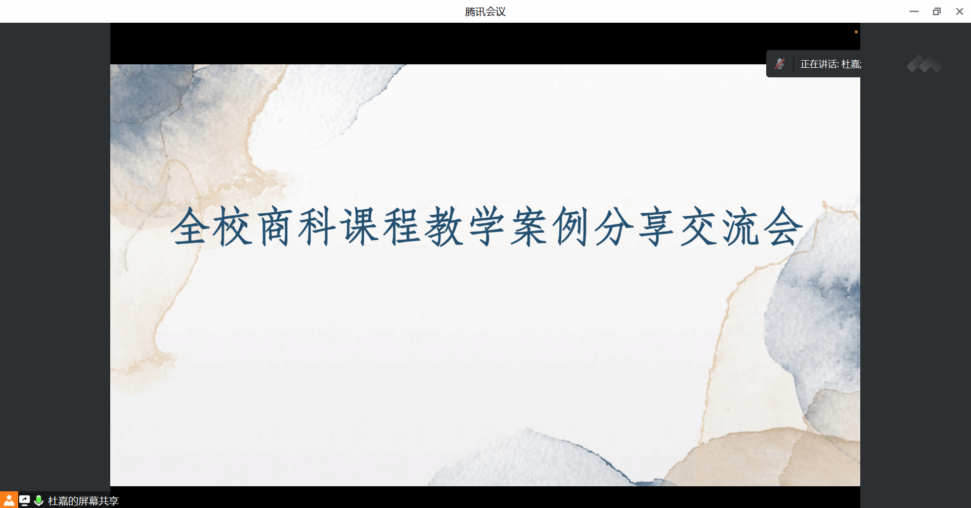 为贯彻我校办学理念,进一步推进全校商科课程建设,淬炼·国际商学院綦江校区于5月10日下午16:00点开展了全校商科课程教学案例分享交流会。本次会议在“腾讯会议”举行,会议由商科认知教研室杜嘉主任主持,四位教师就课程教学案例进行了发言,全体教师参与了分享交流。