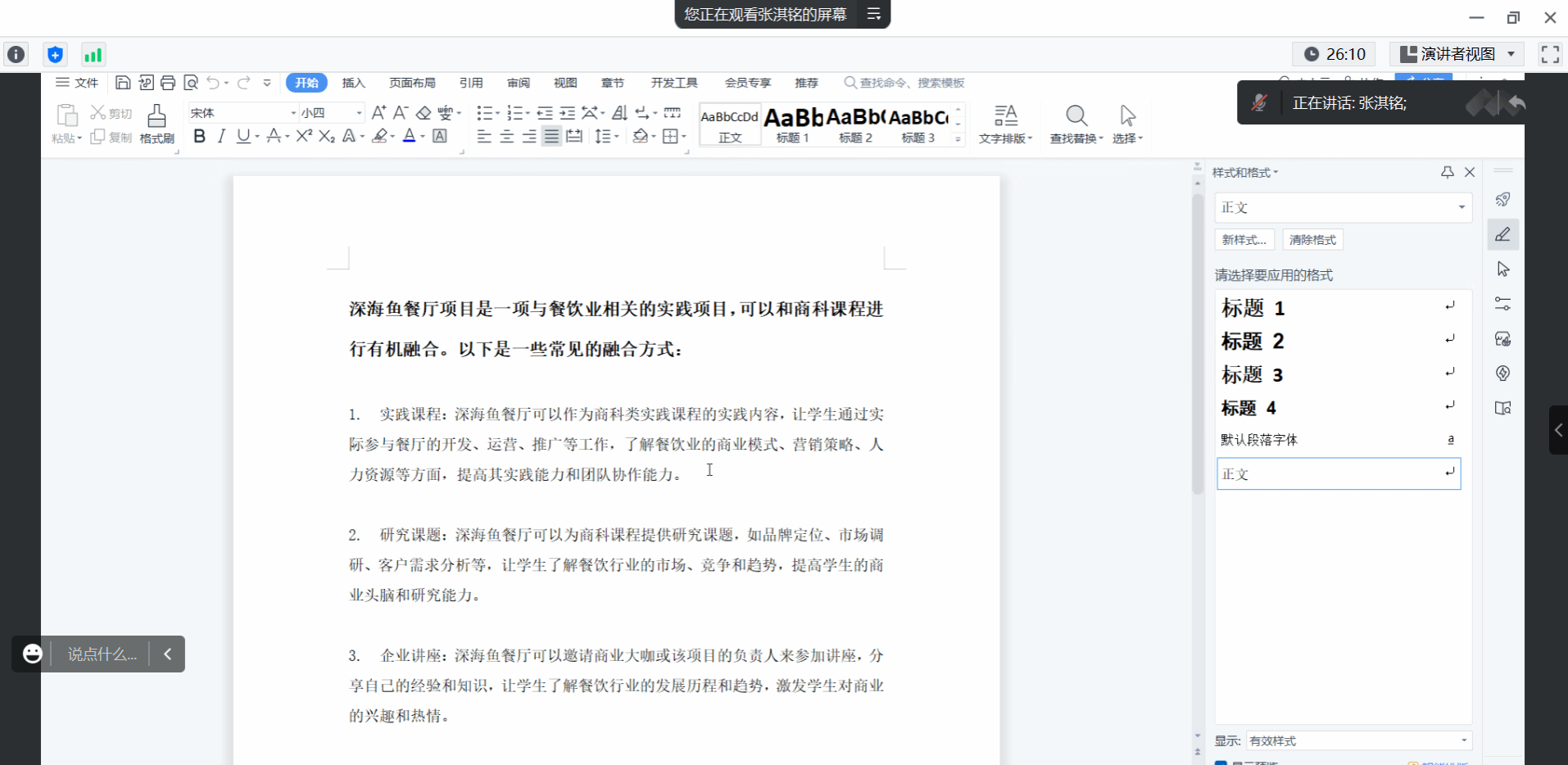 张淇铭老师对“深海鱼餐厅”实践项目和商科课程有机融合进行了分享。学生通过实际参与餐厅的开发、运营以及推广等工作,可以增加其对餐饮业商业模式、营销策略和人力资源等诸多板块的了解,从而切实提高学生的实践能力和团队协作能力。朱思琪老师分享了《消费心理学》相关案例,通过案例让学生更加了解国内互联网行业的基本格局和国内外的互联网成功人士。通过“血型相同”这一现象的讲解,引导学生学习互联网成功人士的优秀品质,培养学生形成企业家精神。