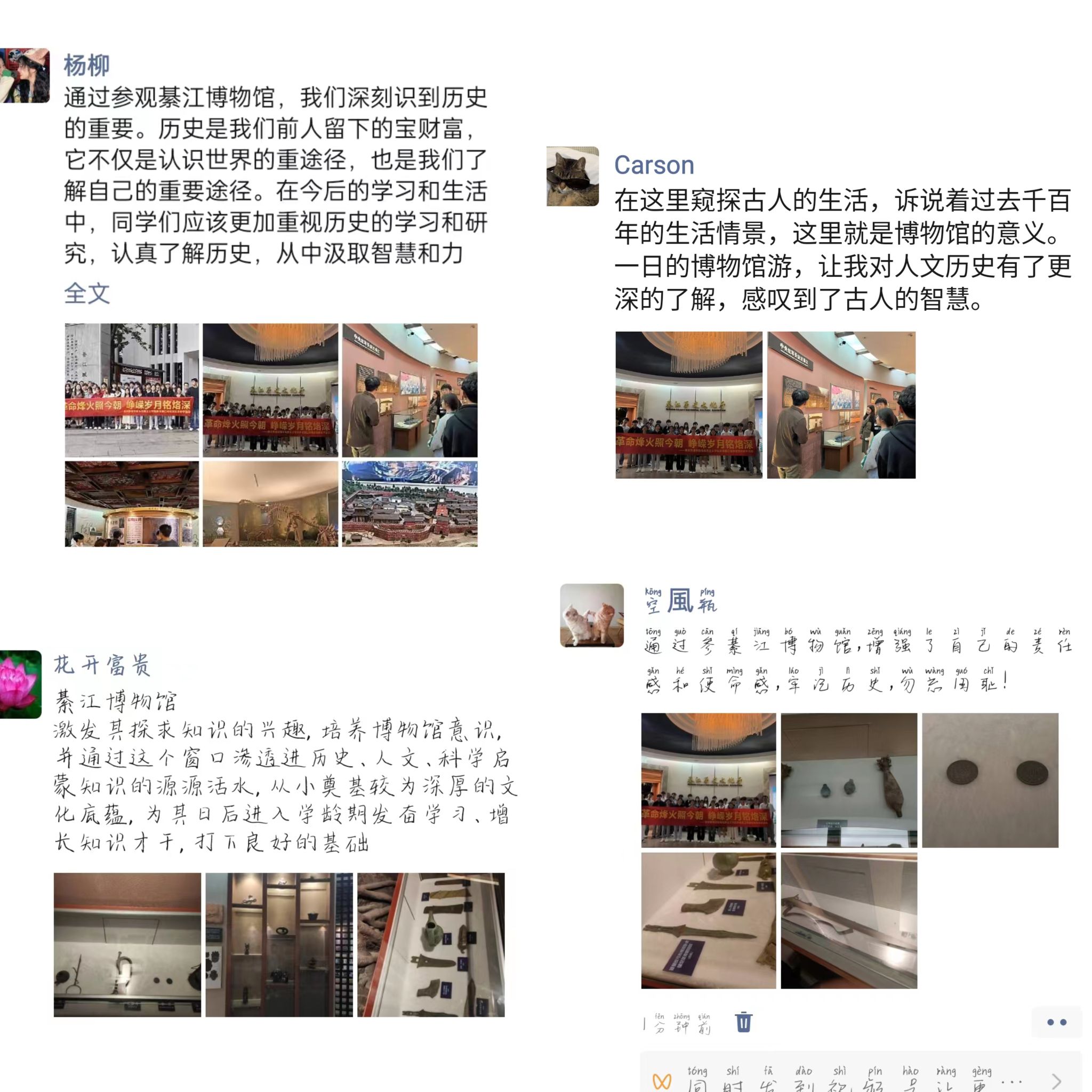 在参观后学生们聚集在一起分享了他们的感受。一些同学表示,在参观綦江博物馆的过程中,他们深刻地感受到了中华文明的博大精深,也了解到了綦江这个地方的历史变迁与文化传承。在感受中华民族的历史和文化底蕴同时,他们也深刻认识到,作为中华民族的一份子,他们有着不可推卸的历史责任和文化使命。还有一些同学表示,在参观綦江博物馆的过程中,他们深刻地感受到了中华民族的文化自信和民族自豪感。他们认为,中华民族拥有着悠久的历史和灿烂的文化,是一个充满活力和创造力的民族。他们希望自己能够继承和发扬中华文明,为中华民族伟大复兴做出自己的贡献。