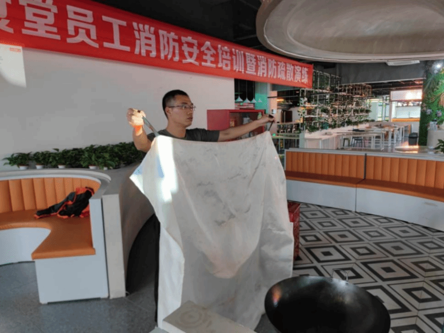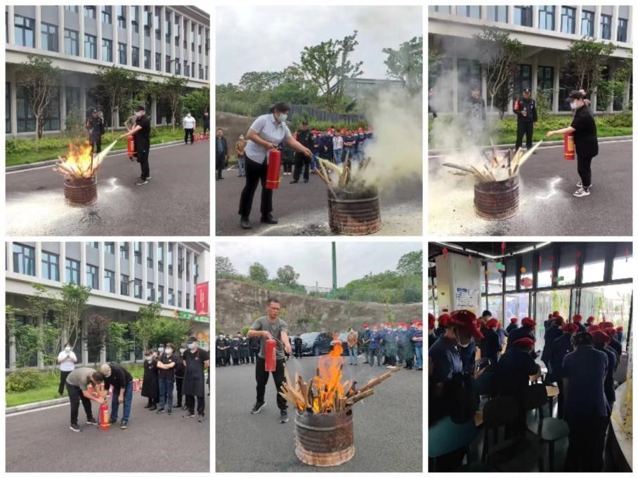 培训最后,为检验培训效果,提高食堂人员逃生自救能力,培训老师还模拟火灾现场,组织实地疏散演练,让培训人员紧急疏散至室外停车场空旷位置,并进行灭火器实操演练。