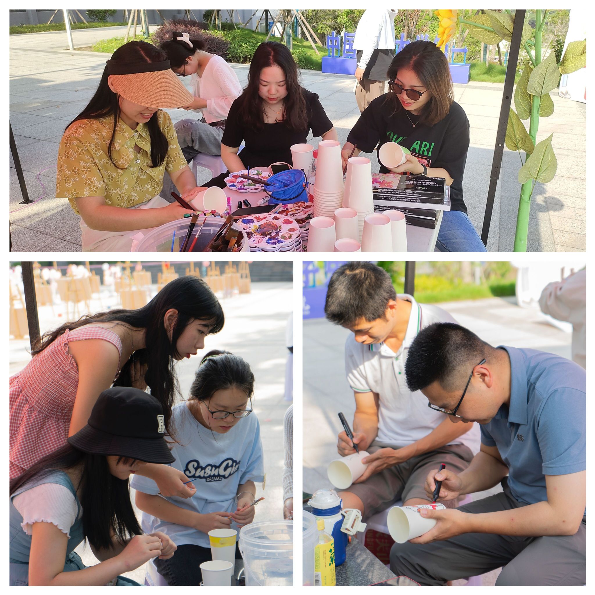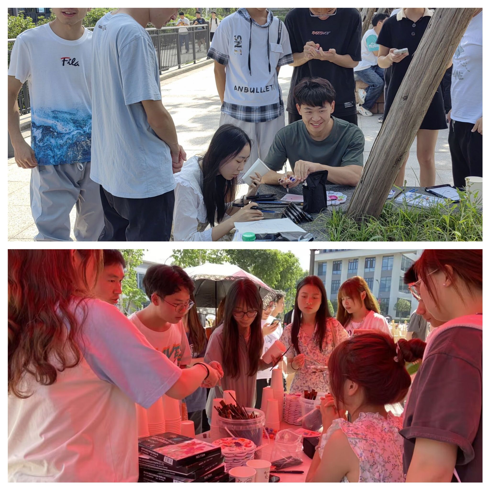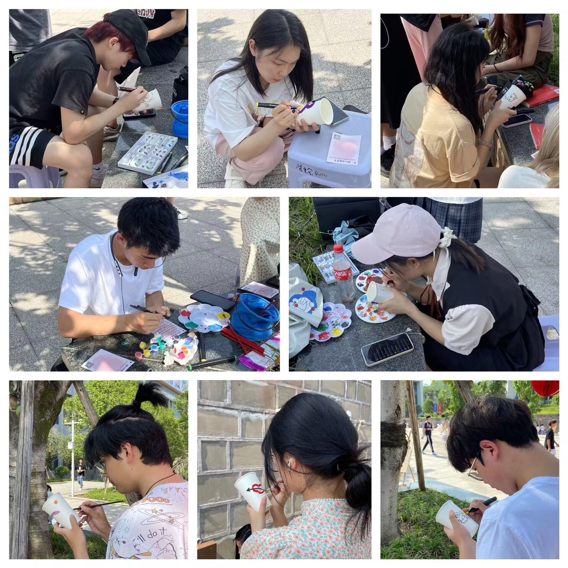 下午两点,参与活动的同学们三俩成群,陆续来到图书馆前广场,在了解具体绘画要求之后,挑选自己适用的作画工具,踏上了今天的绘色之旅。组队创作的多为同寝室的小伙伴、校园结交的知己好友,在工作人员的引导下,轻声商量着挑选喜欢的杯型,分享彼此的画工,伴着抒怀内心的笑容,你一笔我一画的勾勒着脑海中的形状。同学们在团队创作中尽情抒发着心中情绪,也拉近着彼此距离。