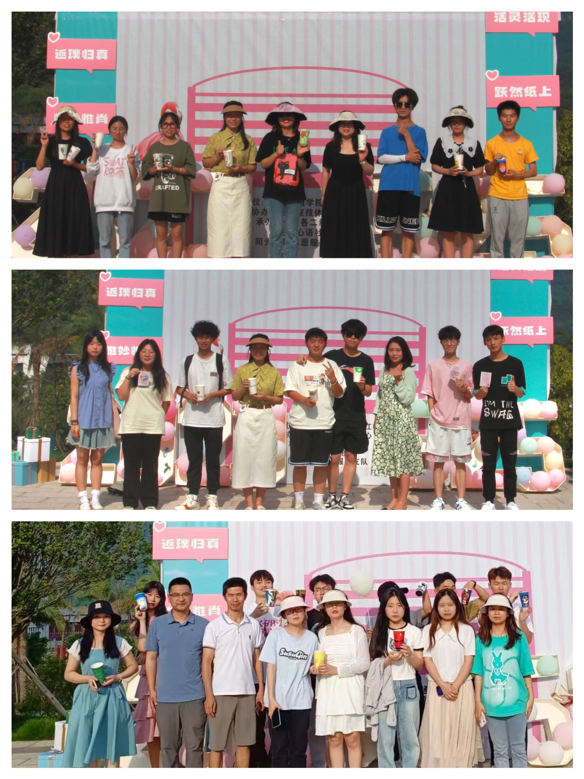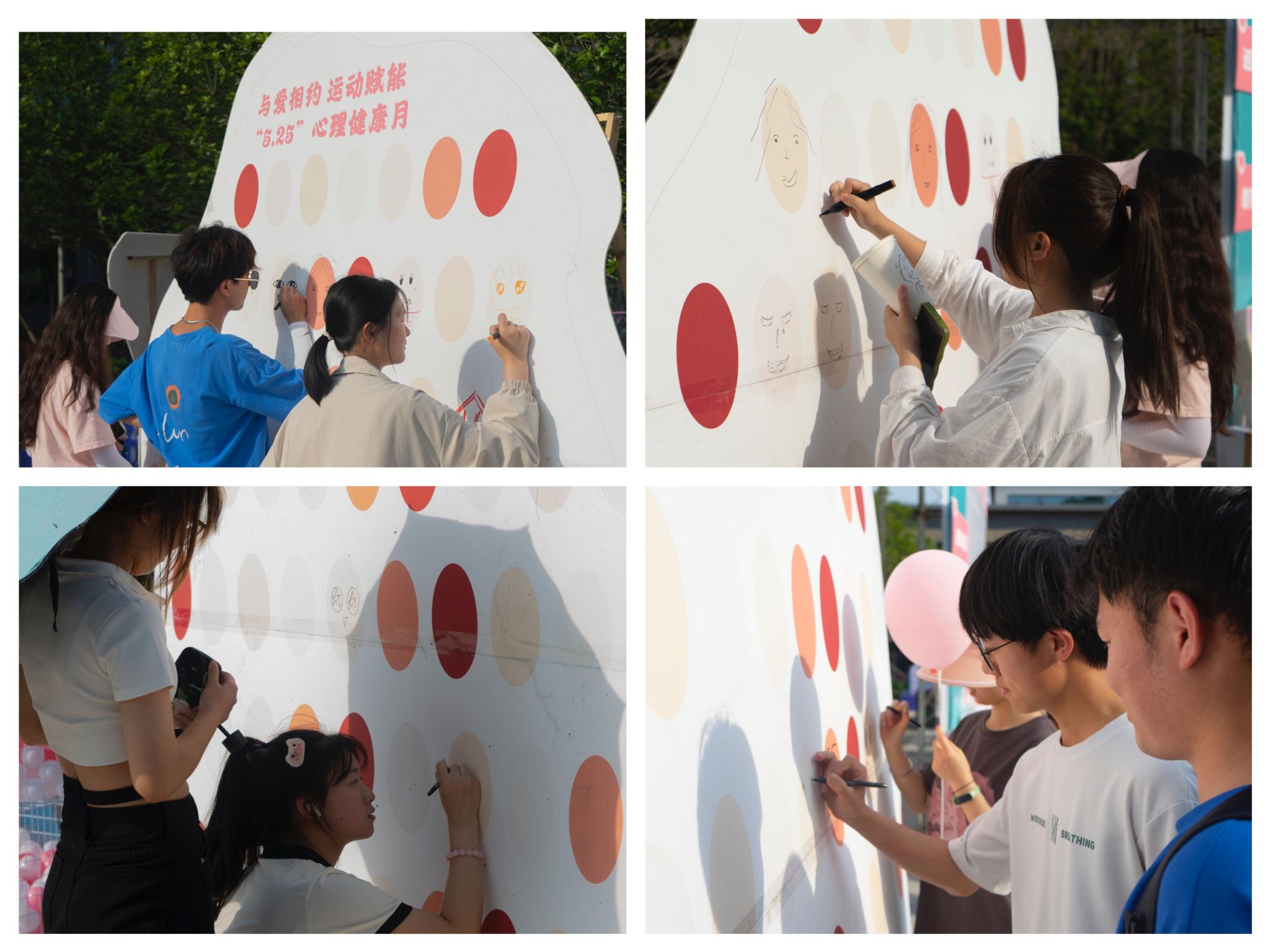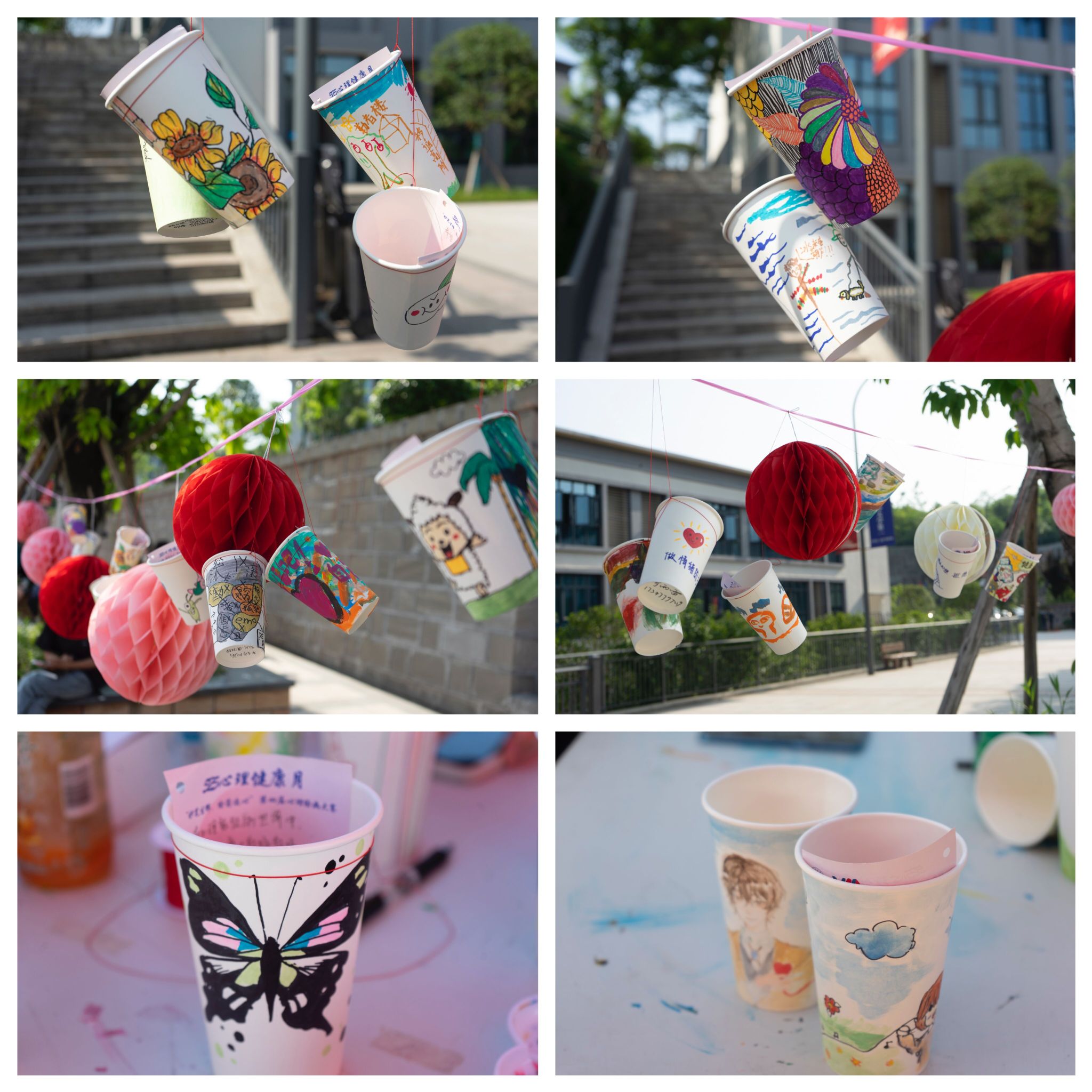 在初夏的暖风中,一幅幅作品也在阳光下逐渐呈现。绘画传达师生内心世界,色调温暖光亮的作品映照着广场的热烈,丰郁厚重的冷色调也呈现着别样的心境和状态。画作从不关乎笔法的高低,而是心灵世界无声的表达,活动现场人来人往,有的来时心情低落,离开却笑意不减。师生从绘画作品中得到心灵的慰藉,展现着丰富的精神世界,分享着近日的心情“色彩”,在不同的绘色中获得独属于自己的成长。
