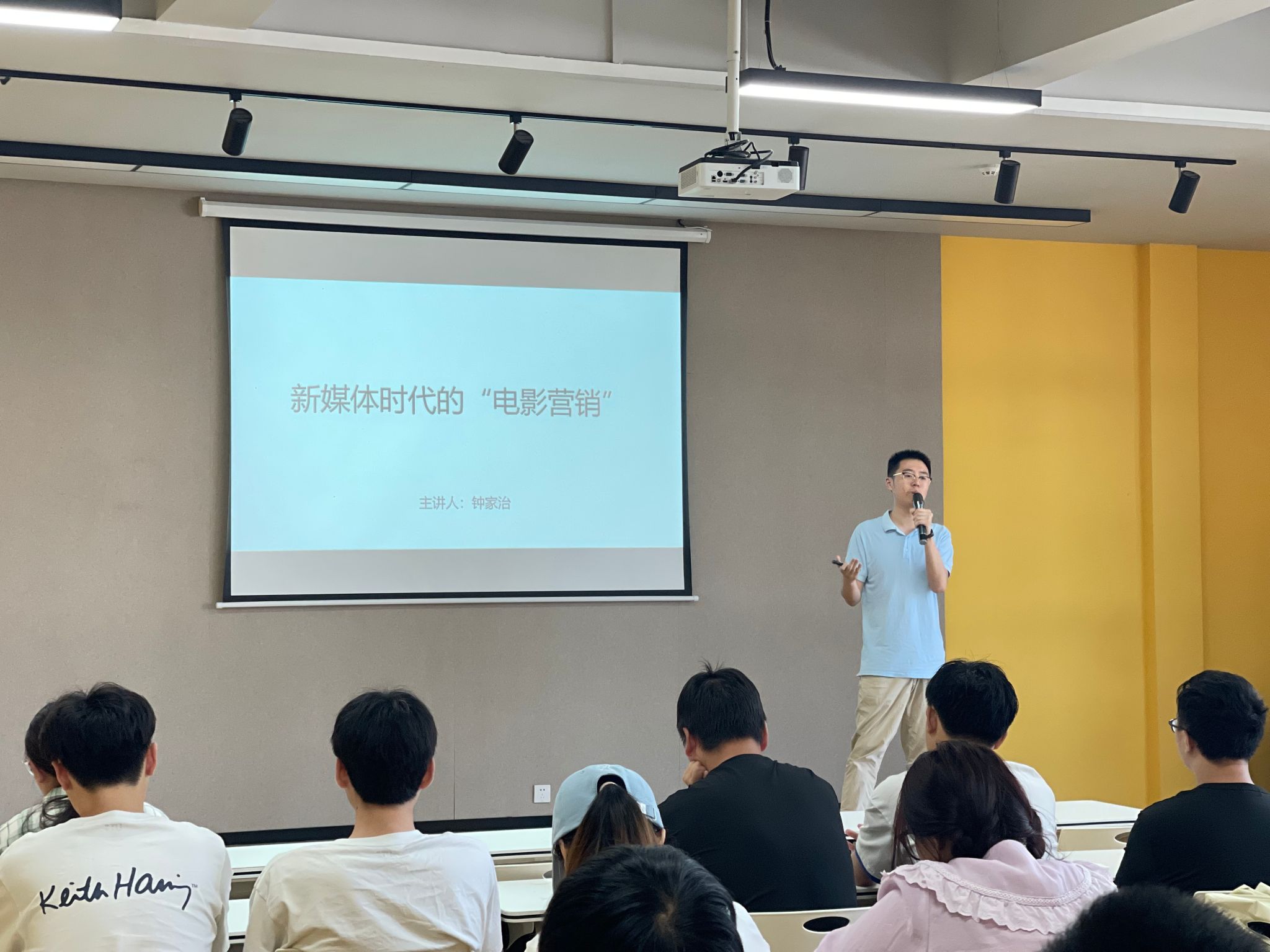 钟家治老师讲述了新媒体时代的“电影营销”。他在讲解时提及了一些网络热“梗”,让大家听着轻松并且更容易理解。钟老师认为,随着社交媒体的兴起和观众需求的多样化,电影营销已经从单一的宣传扩展成为更加互动、多元化的形式。