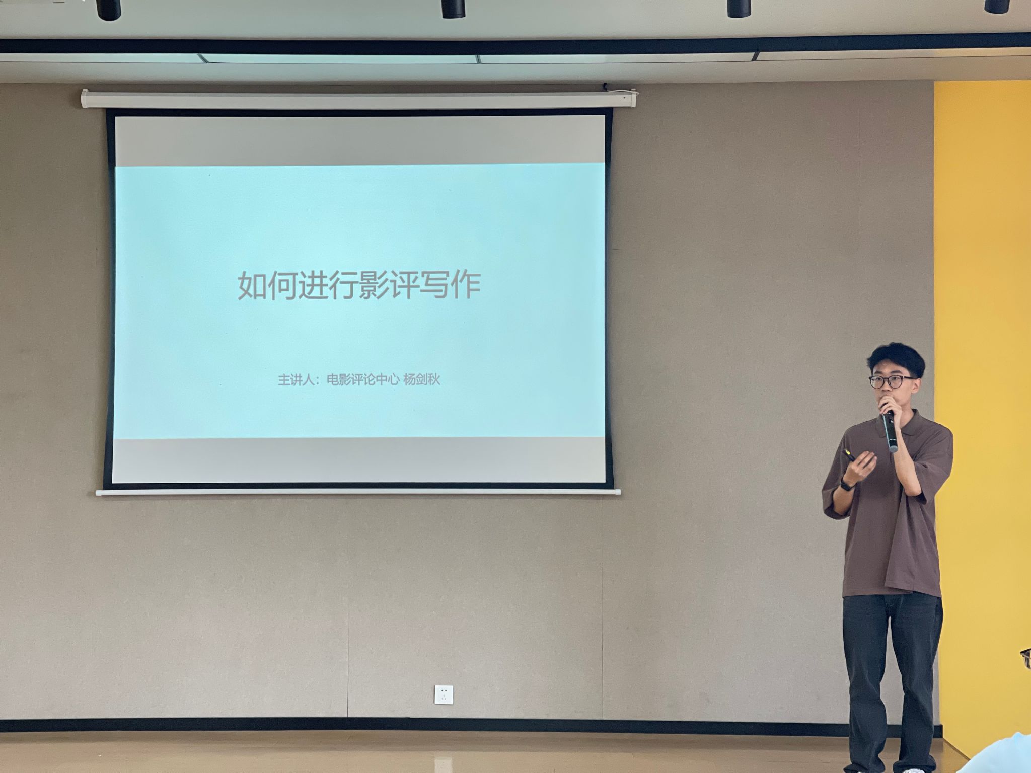 活动一开始,电影评论中心的杨剑秋老师为大家讲解了如何进行影评写作。杨老师通过“感受”、“评论”和“批评”三个词的区别来说明“影评不是观后感”。影评可以让你对自己的观影感受有更深的理解,以你喜欢或者不喜欢某部电影的原因来说服他人。并且,影评写作有其规范性与逻辑性。