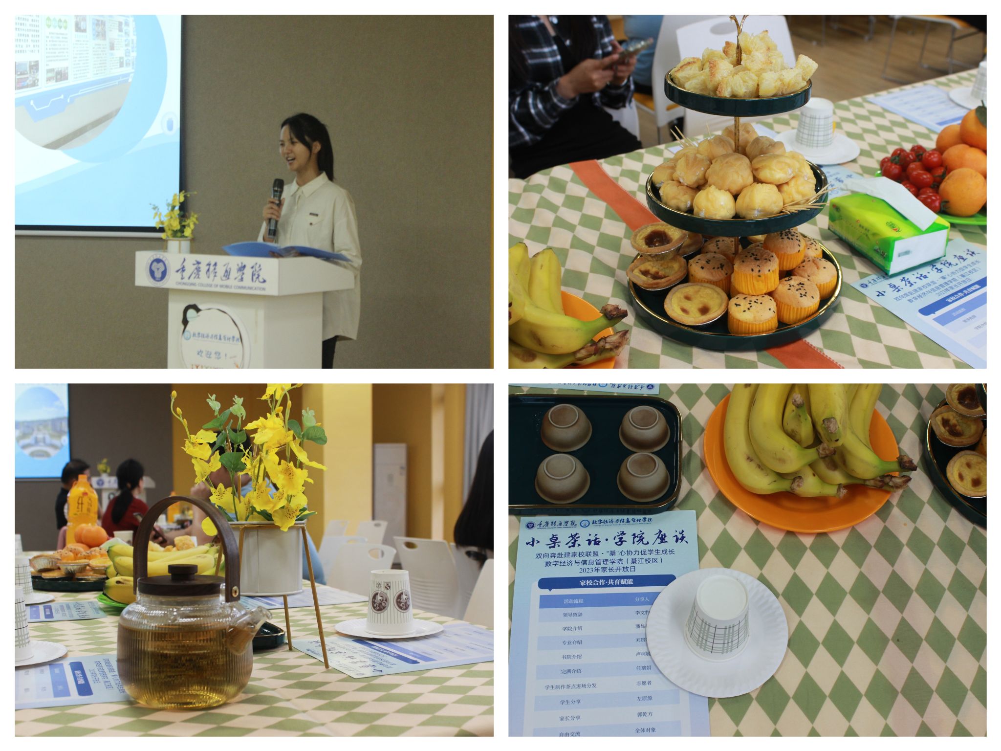 下午一点半镜头转向了瀛溪书院语者演讲培训室,学院领导、教师代表、辅导员们与家长朋友们开展了小桌茶话会,此次会议由2022级数字经济专业晁季瑞同学担任主持。