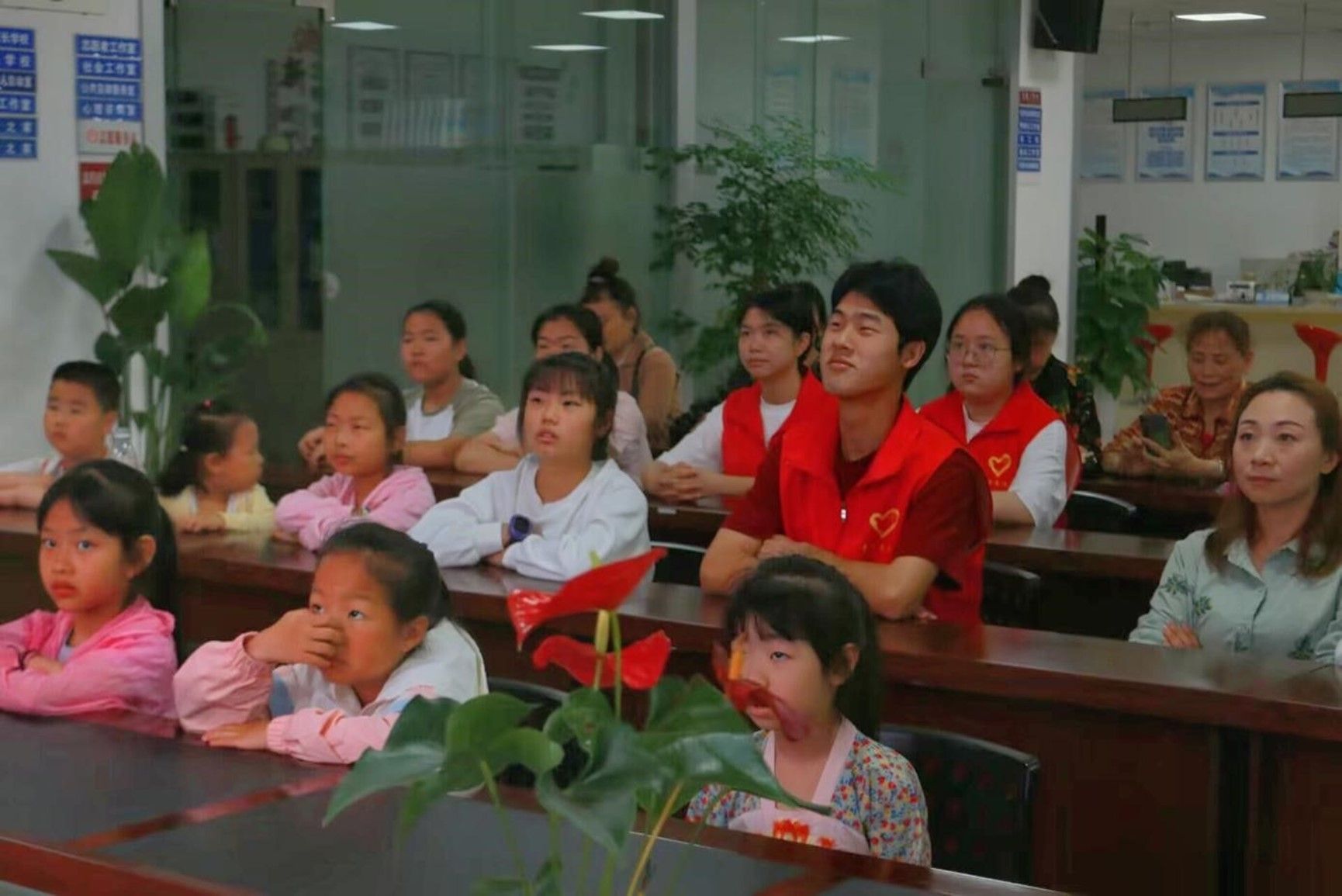 (志愿者和小朋友一起认真听讲)