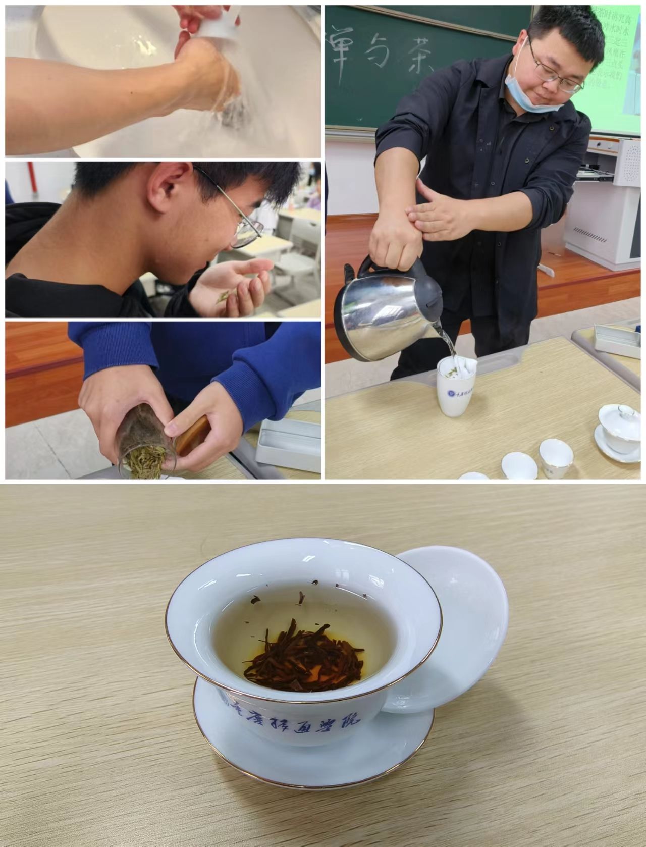 体验茶道,领悟人生。实践全程分为三个步骤,第一,同学们被分成8个小组,在付老师的示范下依次进行净器、鉴茶、投茶、润茶、泡茶。第二,讲泡茶,分“三泡”:初泡;二泡;三泡。这就如同人的一生,每次浸泡都会让你有所成长。同样,不同的人在不同的状态下,喝不同的茶也会有独一份的感受。最后,请小组各代表上台,分享自己对“茶”的品鉴与感悟。