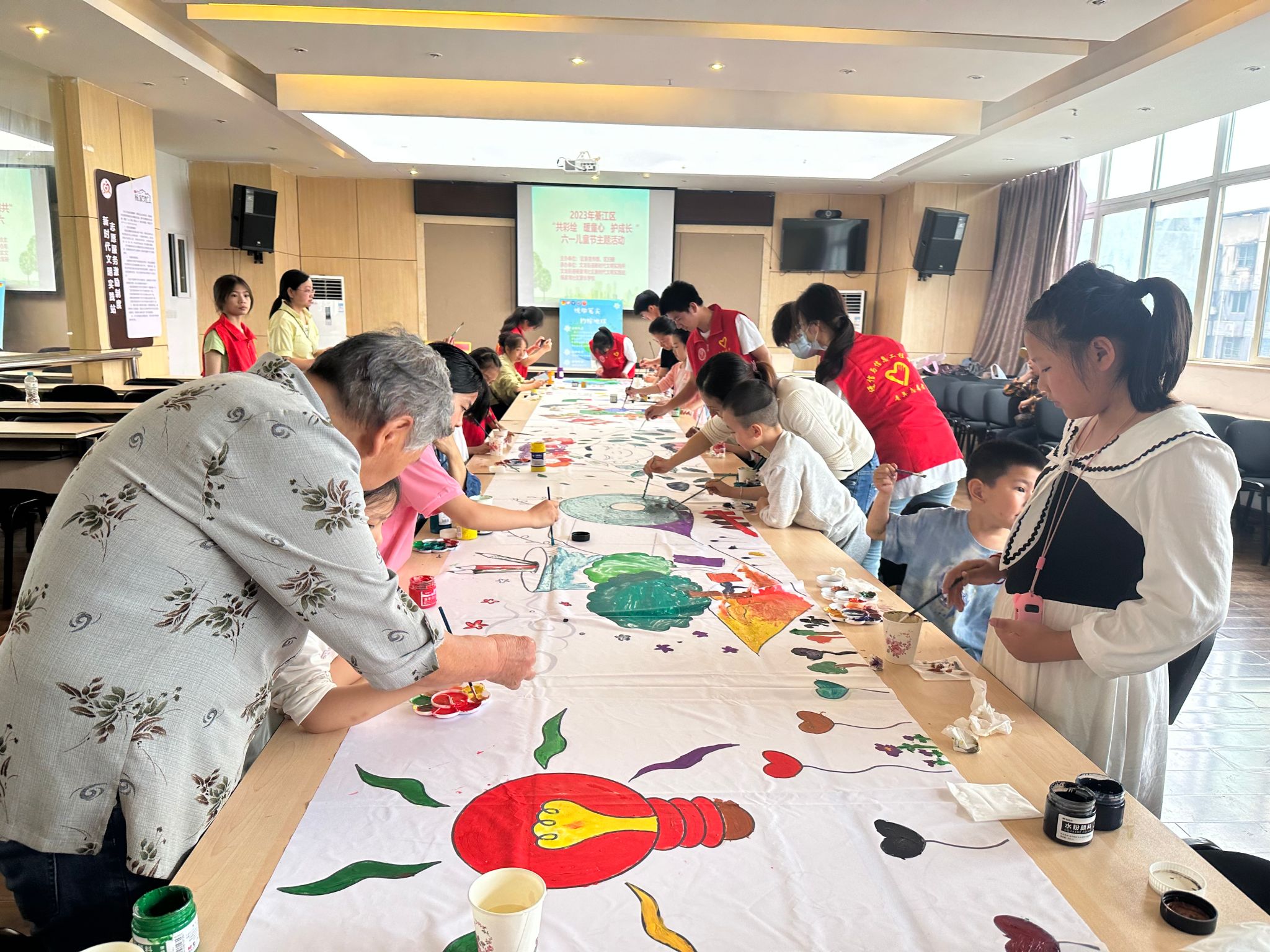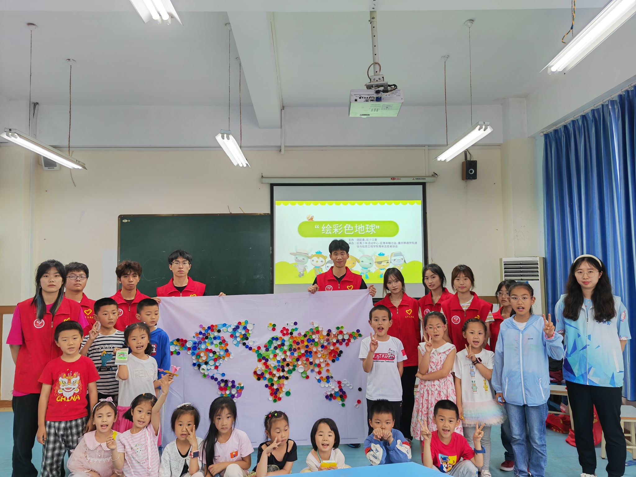 为激发群众的想象力,鼓动大家合力创作,共同完成彩色地球的绘制。开展“绘彩色地球”——青年志愿者在行动活动。志愿者们于5月27日来到綦江区青少年活动中心,将准备好的材料供小朋友们尽情发挥。活动中每个小朋友都参与到了其中,在大家的各自绘画下,一个个剪纸和瓶盖经过再创造变成了好看的图案。本次活动通过丰富有趣的环保活动增强了小朋友的动手能力,同时也让创新环保理念萦绕在每个参与者心中。