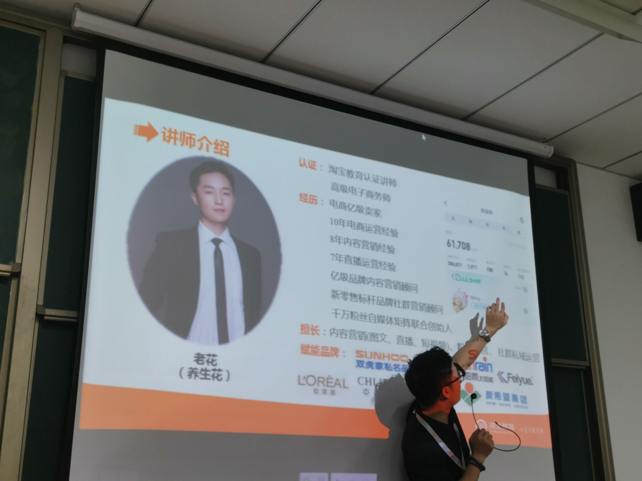 本次的企业导师王先平在分享内容正式开始之前,向同学们介绍了他在企业所担任的一些职务:高级电子商务师、淘宝教育认证讲师的官方认证是他权威的认证;10年电商运营经验、8年内容营销经验等亲身经历是他电商实战经验的积累;擅长内容营销、直播和短视频拍摄促进了他从事此行业。分享人以自身的亲身经历出发,向同学们分享了自己工作中的点点滴滴。