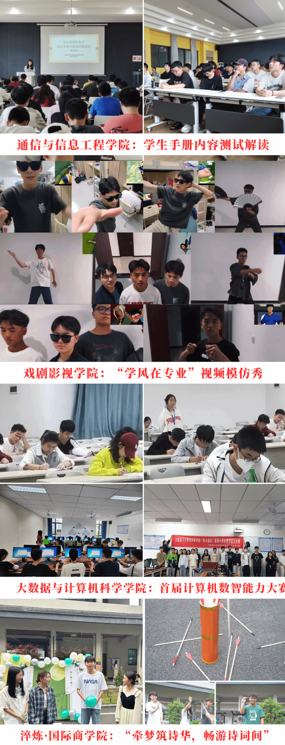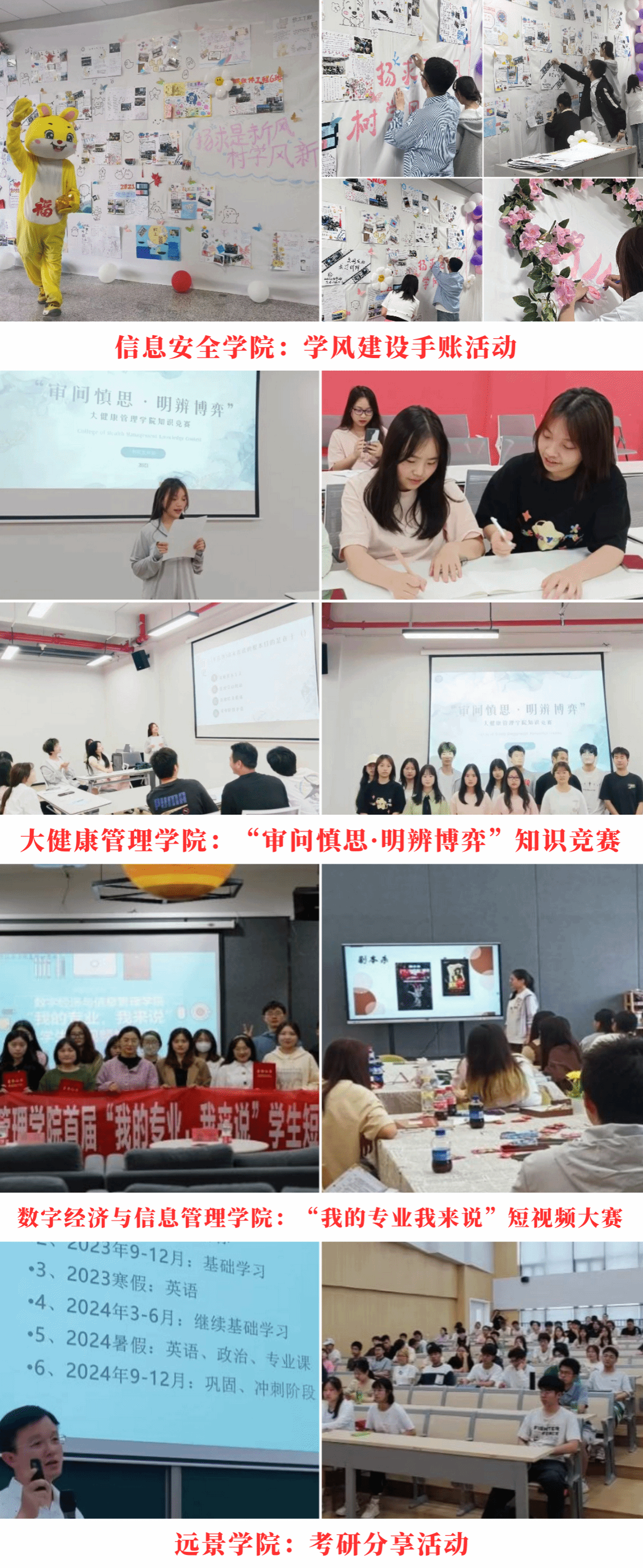 为更好的推动校区学风建设,以更加专业、更加贴合、更加有趣的方式组织开展学风活动,各二级学院积极响应,根据学生专业学科特色,结合班级、学生的实际情况,策划开展适合本院学生的学风建设特色活动,不断探索学风建设完满化、学风建设专业化、学风建品牌化,以班风促学风,以院风引校风,营造校区整体浓郁的优良学风氛围。