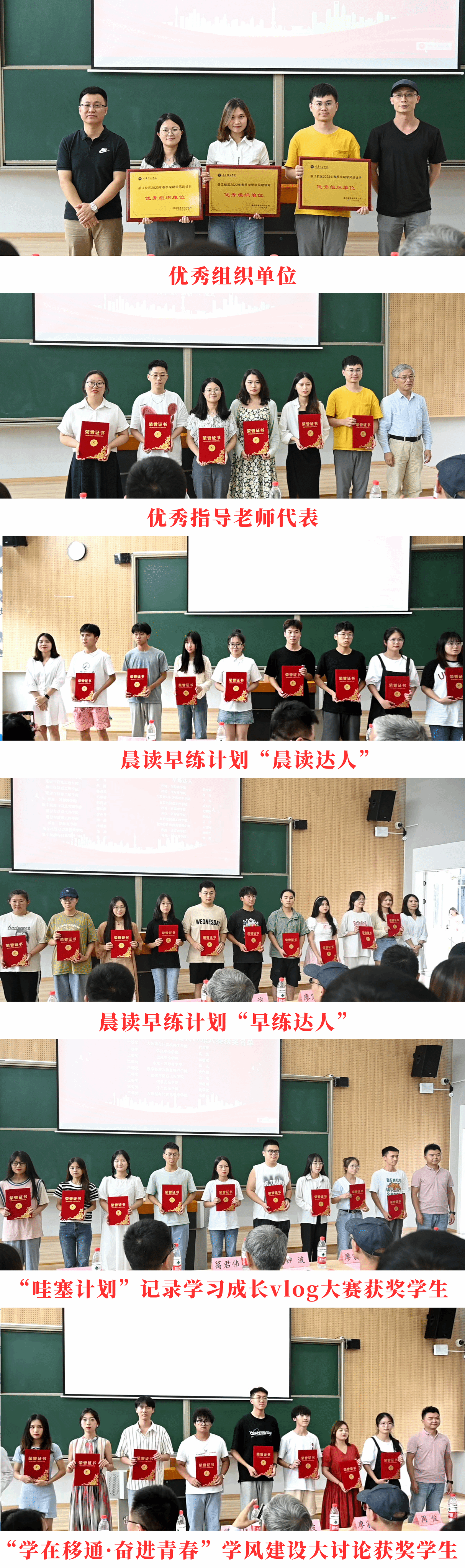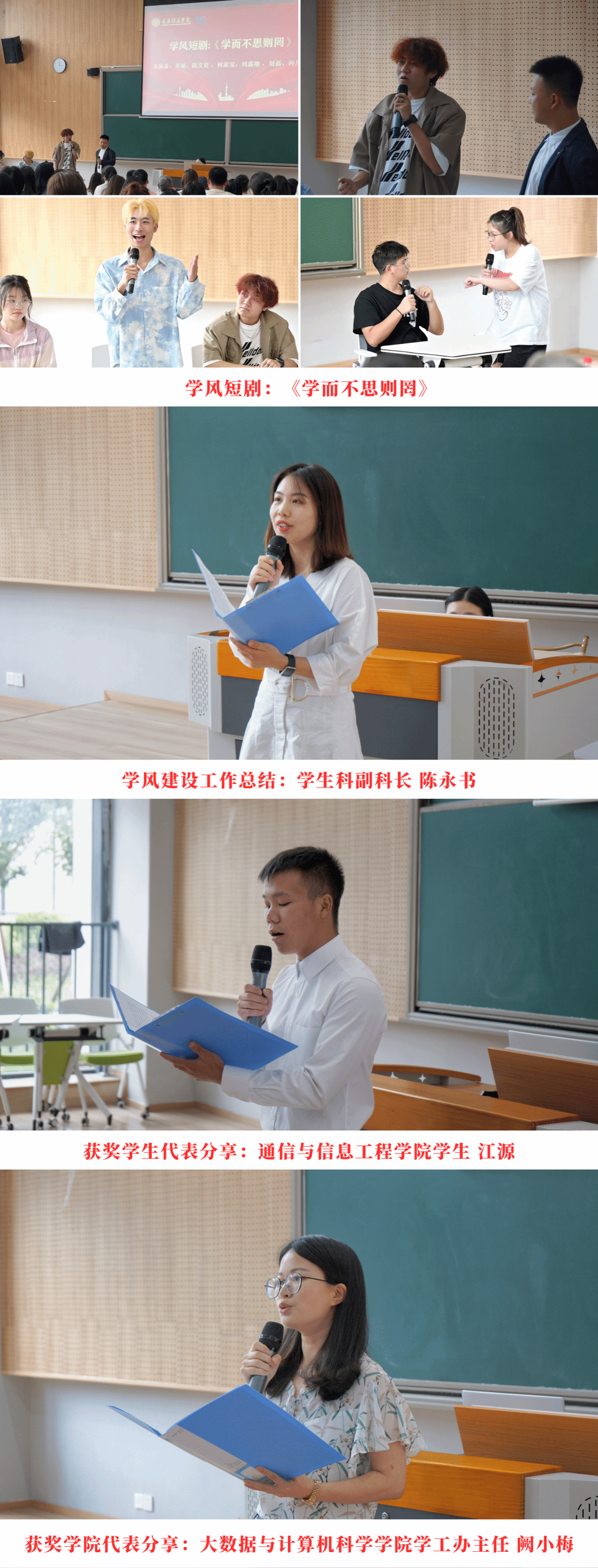 6月9日,2023年春季学期学风建设月总结表彰大会在横山书院阶梯教室隆重举行,教学督导与质量评价中心葛君伟教授,教务处副处长钟波、学生处副处长梁少锋,教务科副科长廖家权、学生科副科长陈永书、各二级学院学工办主任,辅导员、学院学习委员代表参加会议。大会开篇,学风督查员带来原创短剧《学而不思则罔》引发现场同学们对学习的思考。会上,学生科副科长陈永书从晨读早练计划开展、求真学问寝室创建、主题教育活动举办、育人兴趣角落搭建、课堂学风督查、榜样典型树立六个方面汇报了校区投入使用以来学风建设工作总结和成效,获奖学生代表江源结合自己入校两年的学习经历跟大家分享了校区学风变化带给他的感受,学院代表阙小梅分享了大数据与计算机科学学院在学风建设方面的有效探索和做法。学生处、教务处、教学督导与质量评价中心领导为在本次学风建设月中表现突出的个人和集体颁奖表彰。最后,本次学风建设月在最后的《启程》歌声中圆满结束,活动的经验总结和有效做法也将形成工作方案在往后的每学期的延续开展下去。
