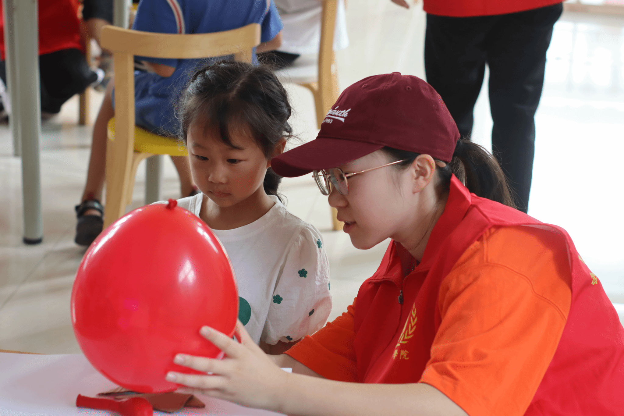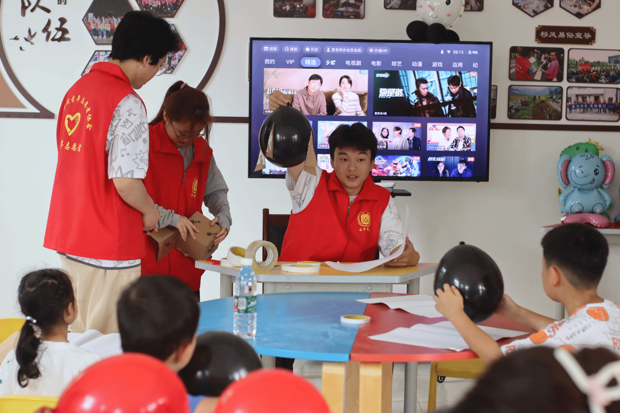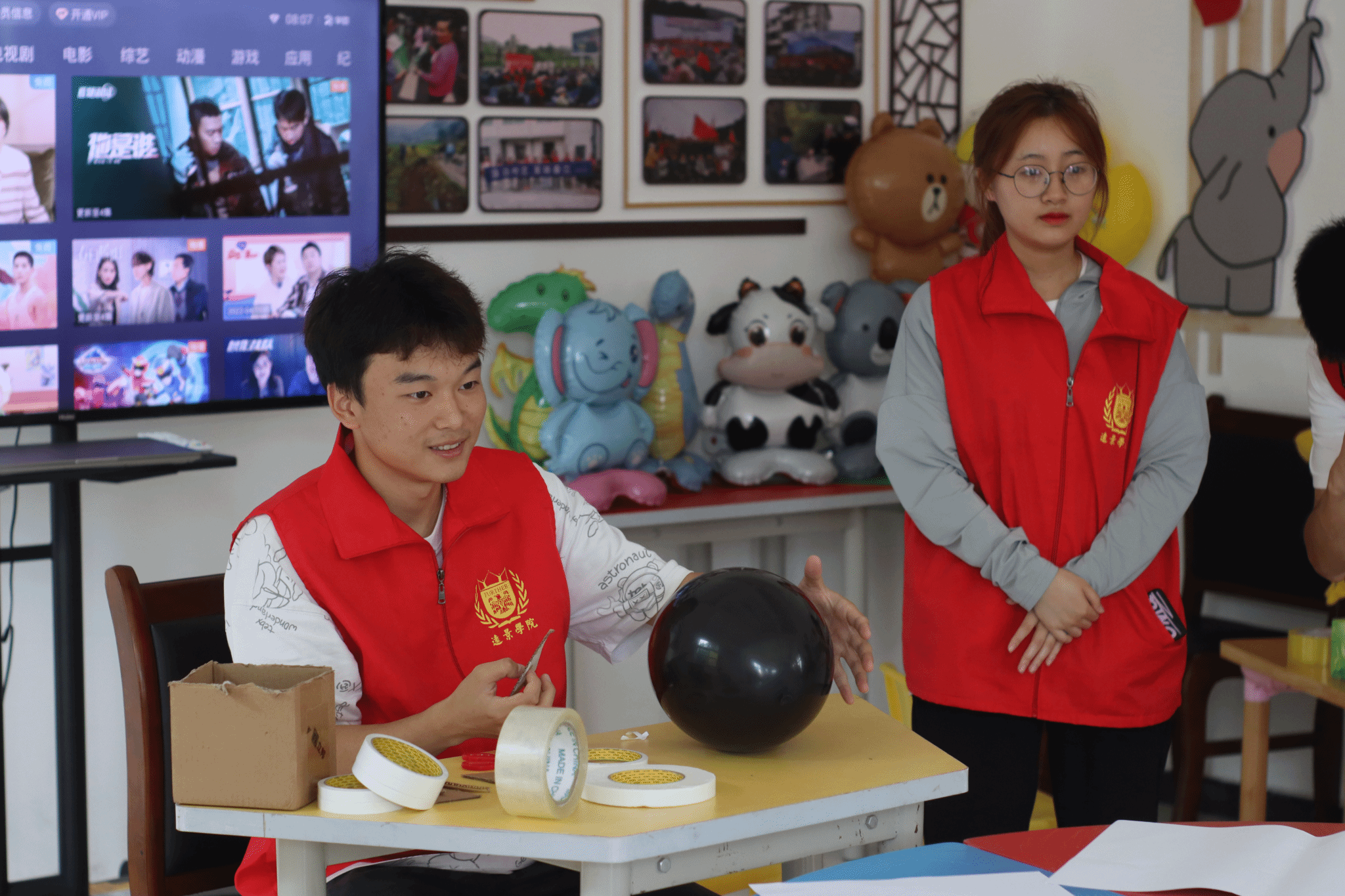 志愿者倡导低碳环保理念,给每位小朋友分发制作火箭核导弹实验所需要的材料:气球、纸板、木条等。青年志愿者曾茂森详细讲解火箭核导弹的实验制作过程、发射原理以及注意事项。小朋友跟着他的讲解,纷纷开动脑筋,一步一步的动起手、操作起来,他们利用手中的吹气的气球制作火箭模型,用胶带粘连瓶身,裁剪纸板、固定底部、火箭头,拿出硬纸板裁成形状做成火箭尾翼,用双面胶粘在需要的位置,每个人都忙得不亦乐乎,他们积极学习的那股劲,也感染着志愿者的心;他们脸庞的笑容,给予志愿者最大的肯定,在志愿者和小朋友的共同努力下,火箭顺利制作完成。