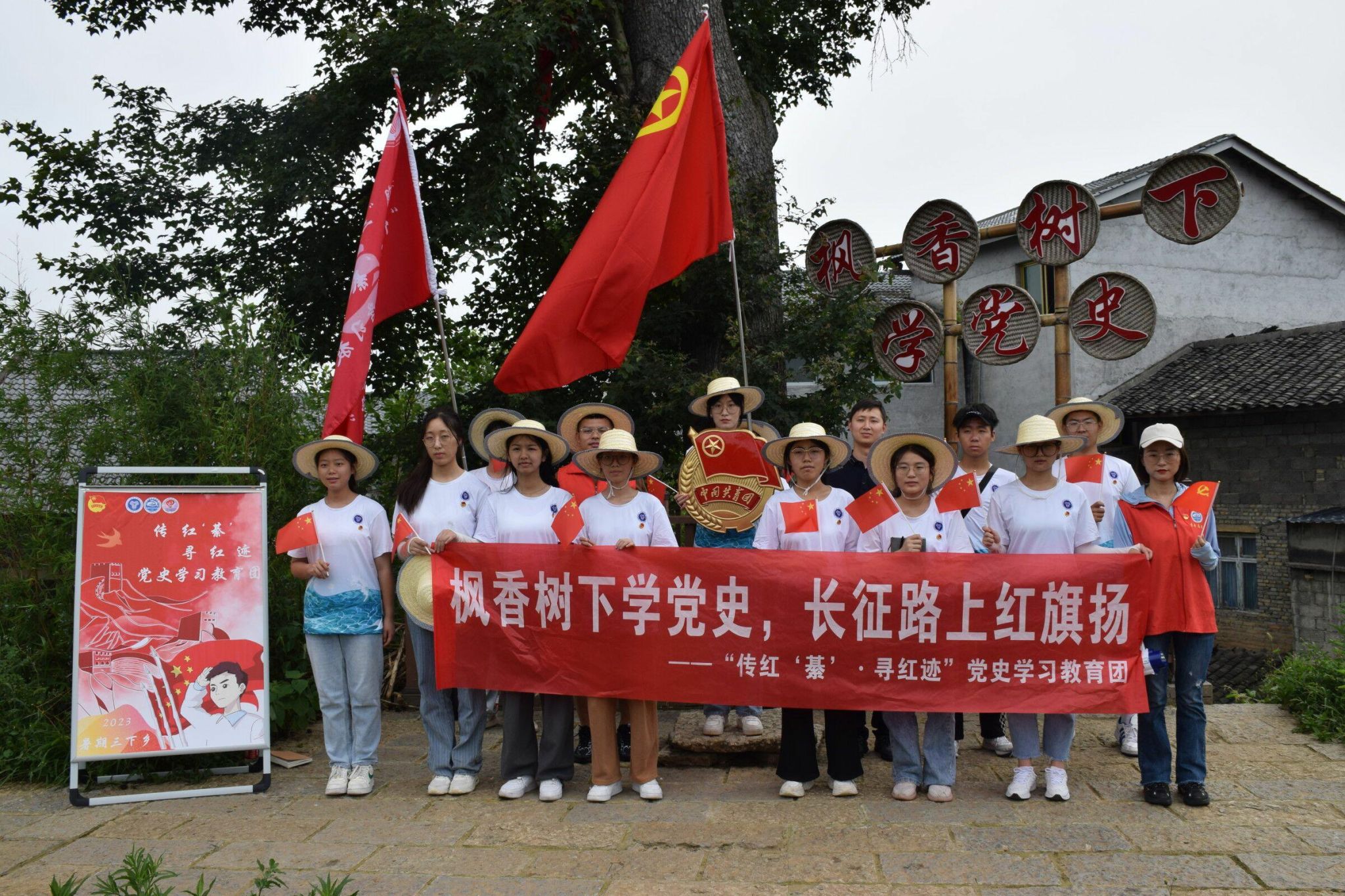 随后志愿者们来到羊角村的标志地点——枫香树,在这棵有着400年历史的枫香树下,志愿者搭好长椅,倾听红军长征途中在羊角村发生的故事。当我们听到蒋朝二的故事时,志愿者们都不禁为此动容。在蒋朝二进入人民解放军,成为一名光荣的解放军战士后,他满腔热血,英勇作战,但却不幸牺牲了,在他牺牲后,国家为他的家人补助了五百斤大米,英雄的父母怀着对新中国的满腔热爱,拒绝了这五百斤大米,政府用这五百斤大米的费用为英雄立了纪念碑。英雄的故事永远不会被磨灭,如今我们又深刻地了解了这个故事,相信红军故事和红色精神将会一代一代传下去。党史学习的最后,何书记说道:“新时代的青年一定要牢记使命,向英雄们学习,为中国做出贡献”。
