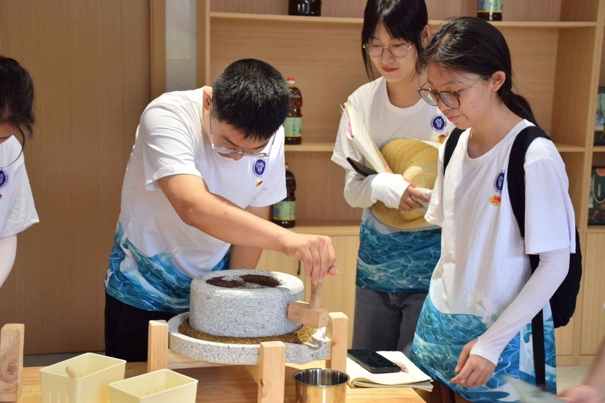村民委员会旁的羊古僚油坊是一个只用于加工村民种植油菜籽的榨油坊,由于天长日久菜籽油香气的侵润,一靠近“羊古僚油坊”,便闻到阵阵菜籽油香沁人心脾。伴随徐徐微风,志愿者们在油坊前与羊角村何书记汇合。在何康书记的带领下,一行人进入了油坊,油坊内,一旁工作者有条不紊地进行着榨油工作。另一旁何书记拿上喇叭为志愿团介绍榨油工作的细节,在机器的作用下,一滴滴浓香、滚烫的菜籽油就榨出来了,随着菜籽油的滴落,油饼也不停地往外冒。何书记介绍说:“这油饼可是个供不应求的好东西呀,用来做家禽的饲料、作物的肥料都是极好的。”志愿们拿上铁锹和尼龙袋将油饼一铲一铲装进口袋中封装好。在榨油坊听书记讲解羊角村历史和切身劳作的志愿者们也更加深入地了解了艰苦奋斗的长征精神。