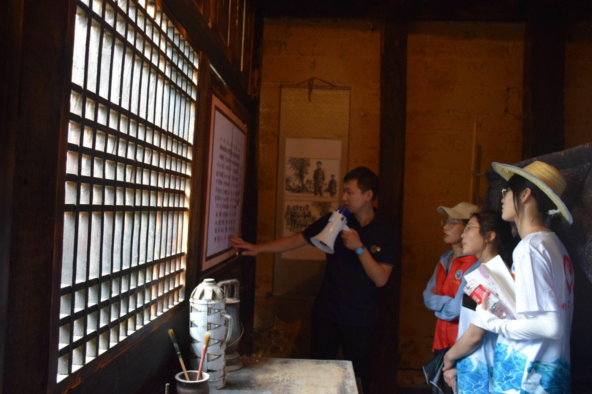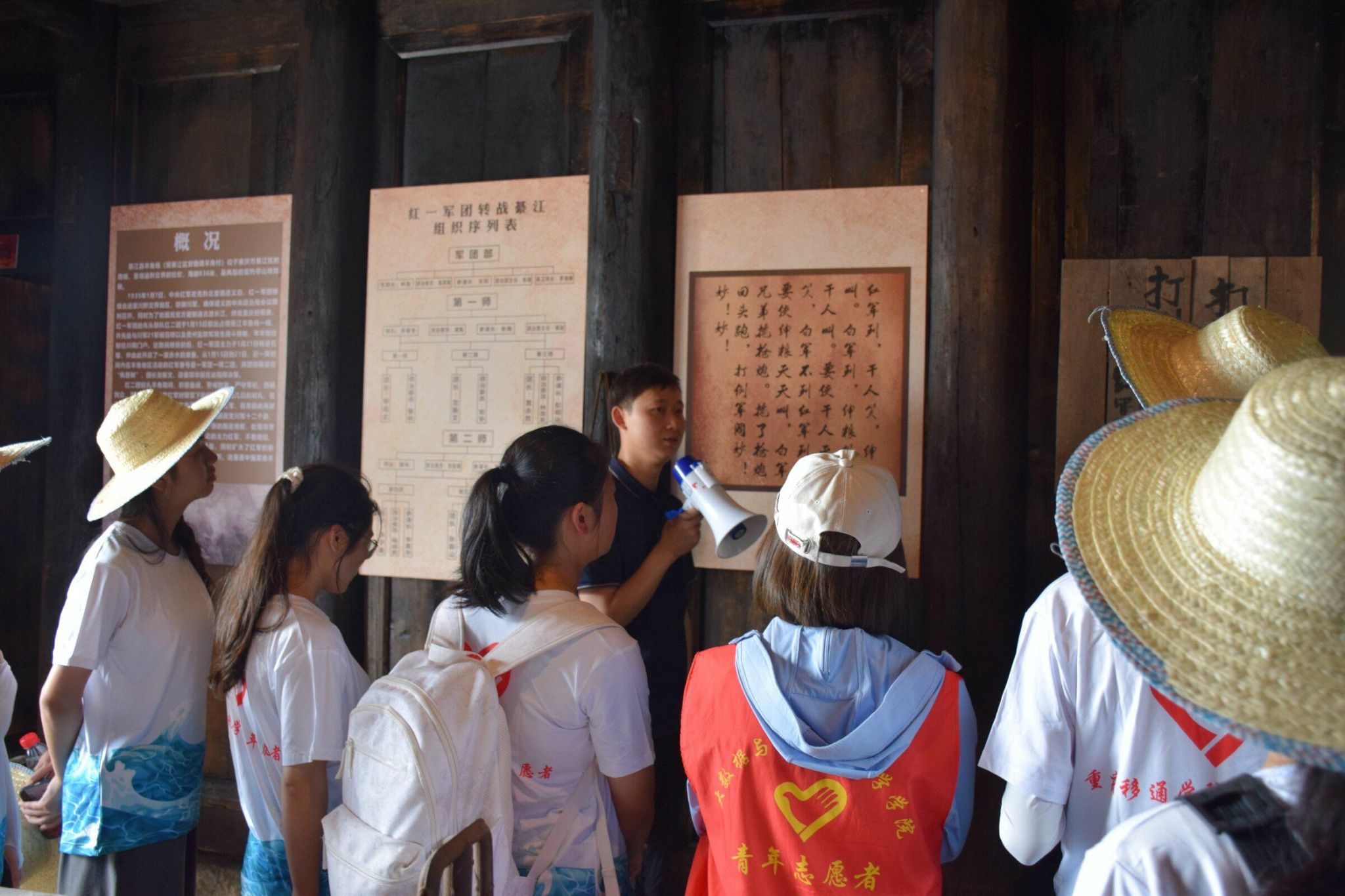 红一军团一师二团在团长龙振文和政委邓华的率领下,进驻綦江羊角的枫香树、红稗土、大垭口一带,监视驻扎在川黔边境一带的川军和黔军行动。现今,志愿团又踏入了二团指挥部旧址,行走古道,触摸时间的留痕,光阴穿梭,带走的只有浮华,一踏入指挥部旧址,一张简陋的木桌和长椅印入眼帘,历史的气息扑面而来,时光荏苒,新时代的青年踏入旧址,一件件历史遗物如同一架架时空穿梭机将志愿者带到长征时期,历史的画卷重新铺展开在志愿者的眼前。
