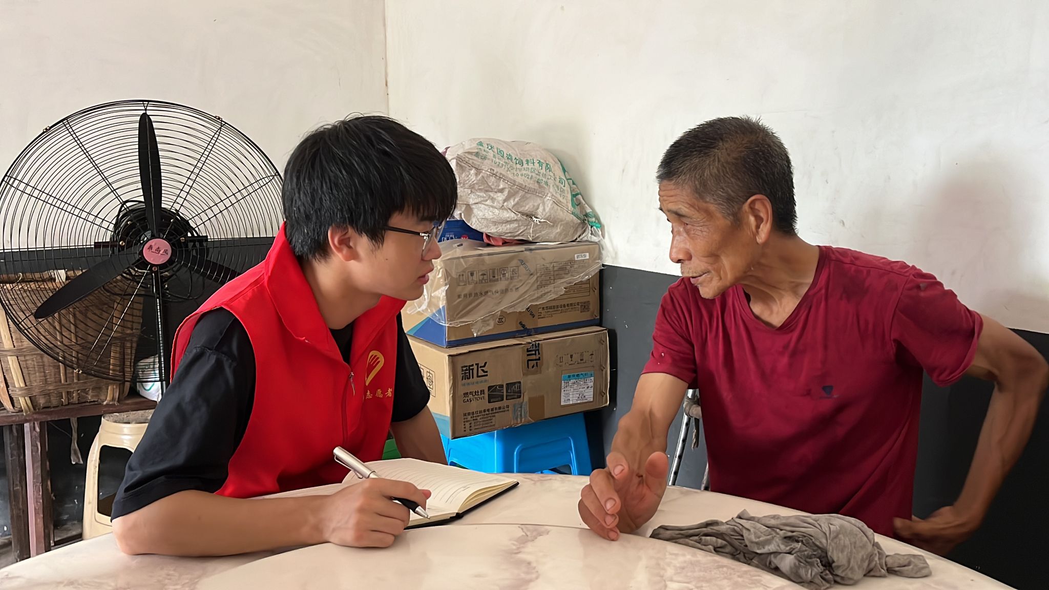 (图为志愿者与老党员交谈)