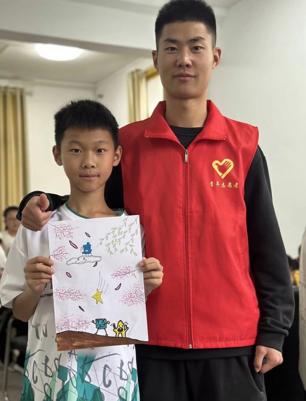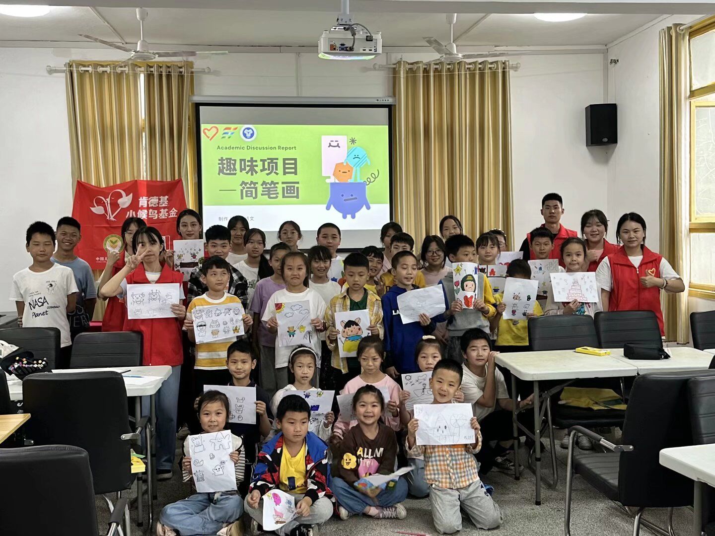 简短的休息之后小朋友们回到座位,以及开始期待下一个趣味课程了。志愿者们拿出绘画纸分发到小朋友们的手中,告诉小朋友今天的趣味课堂是“色彩斑斓、绘艺阳光——简笔画”