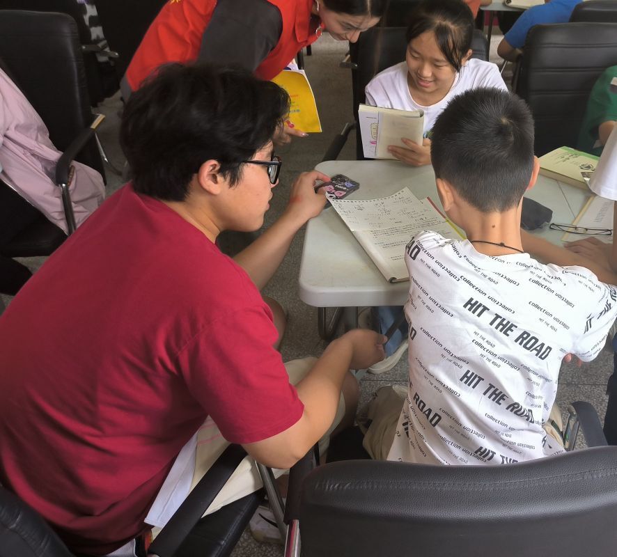 充足的午休之后小朋友们重返课程,他们因为作业而微微严肃的脸庞出现在相机里,可手中的笔却没有停下,而是依靠这笔认真灌溉心里名为知识的田野,志愿者们也在其中担任着短暂的园丁为其答疑解惑,为祖国的未来添砖加瓦。