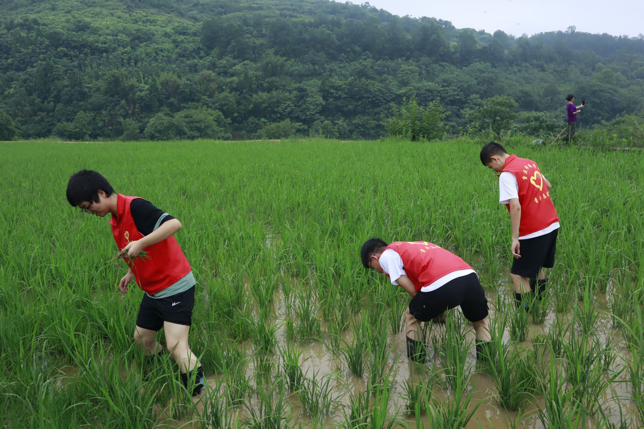望着一片片稻田,寨门村第二大队胡队长仔细地向同学们讲解着如何分辨水稻和杂草、如何正确根除杂草等相关知识。在确保安全的情况下 ,促进团信心满满,干劲十足,穿上雨靴,跟随胡队长的脚步纷纷下田。青葱的稻田间虫鸣蛙叫,燥热的暑气随着一脚踩破水的声音散去,促进团几个成员脚踩泥泞的田地,俯身闻着呼吸泥土的气息,将一株株杂草连根拔起,感受着脚踩大地背朝蓝天的农作。一分耕耘,一分收获。经过一小时的努力,原本布满杂草的田间,变得间隔分明,“志在希望的田野上”的志愿者们体会到劳动的可贵,感受到粮食的珍贵,同时也收获了宝贵的经验。