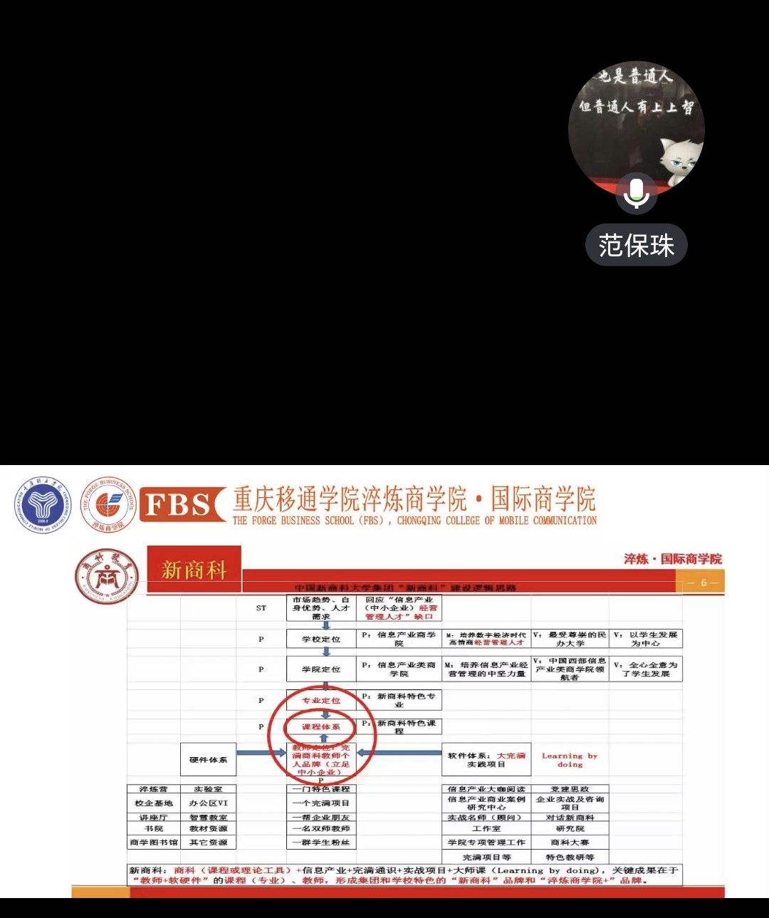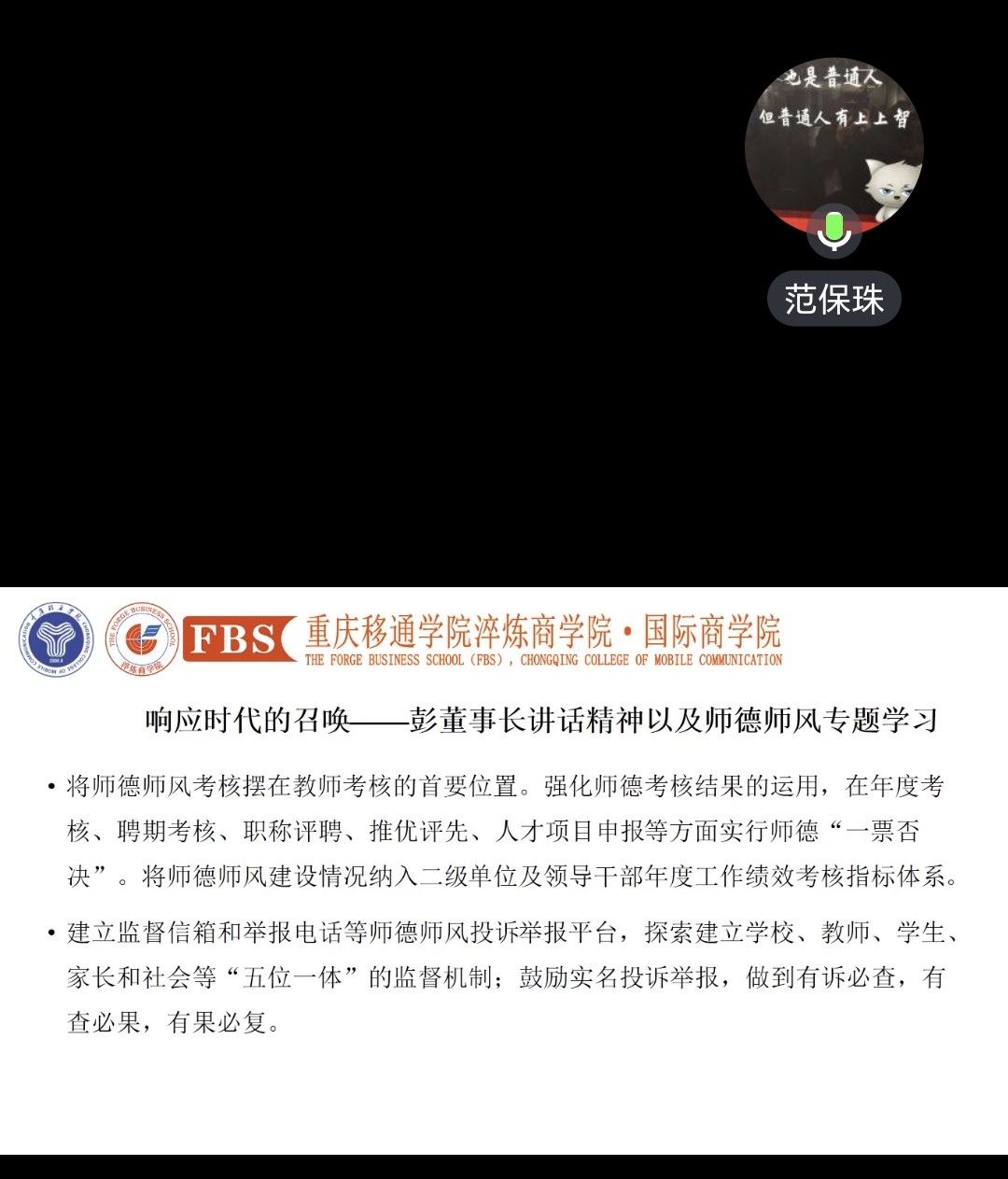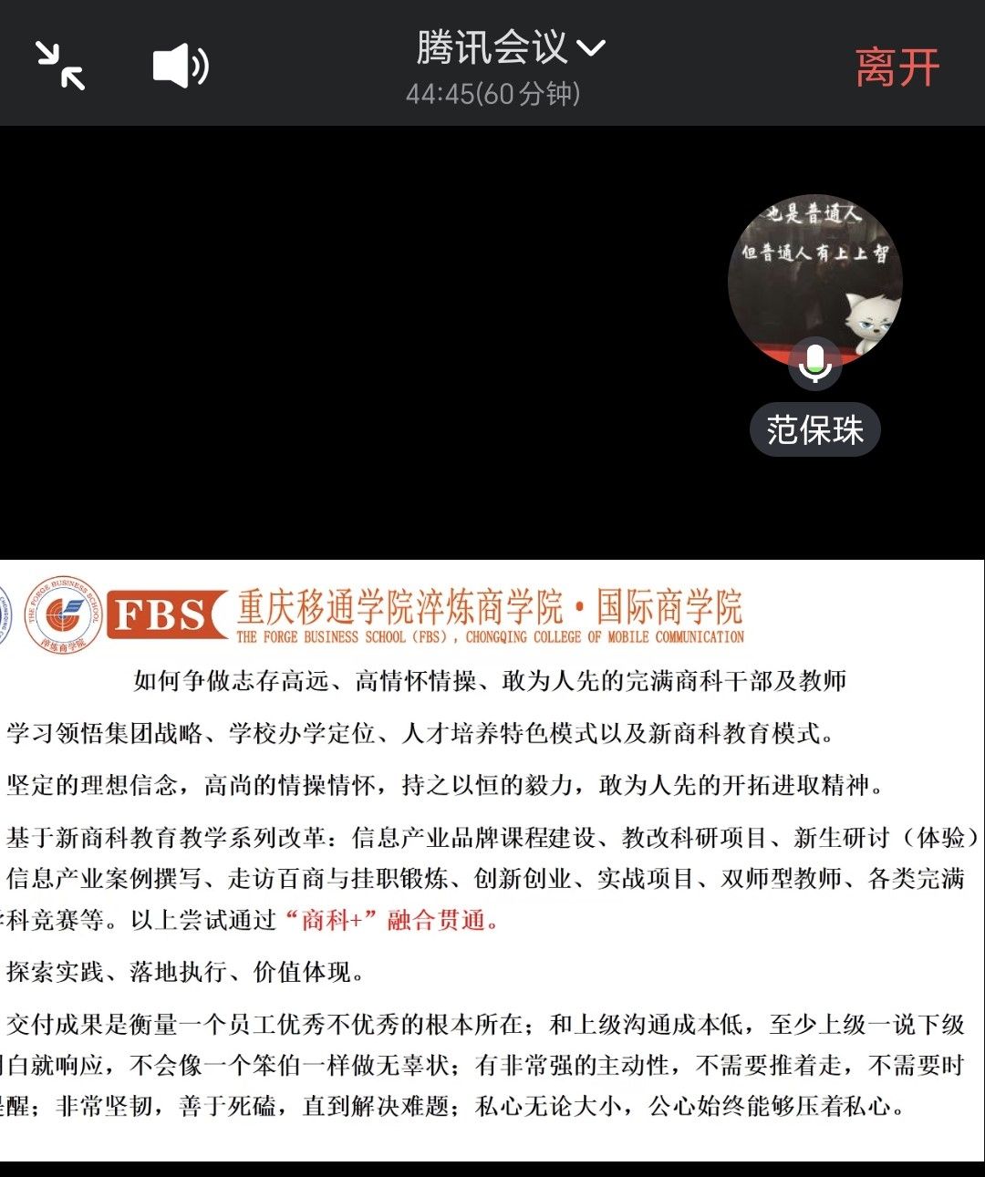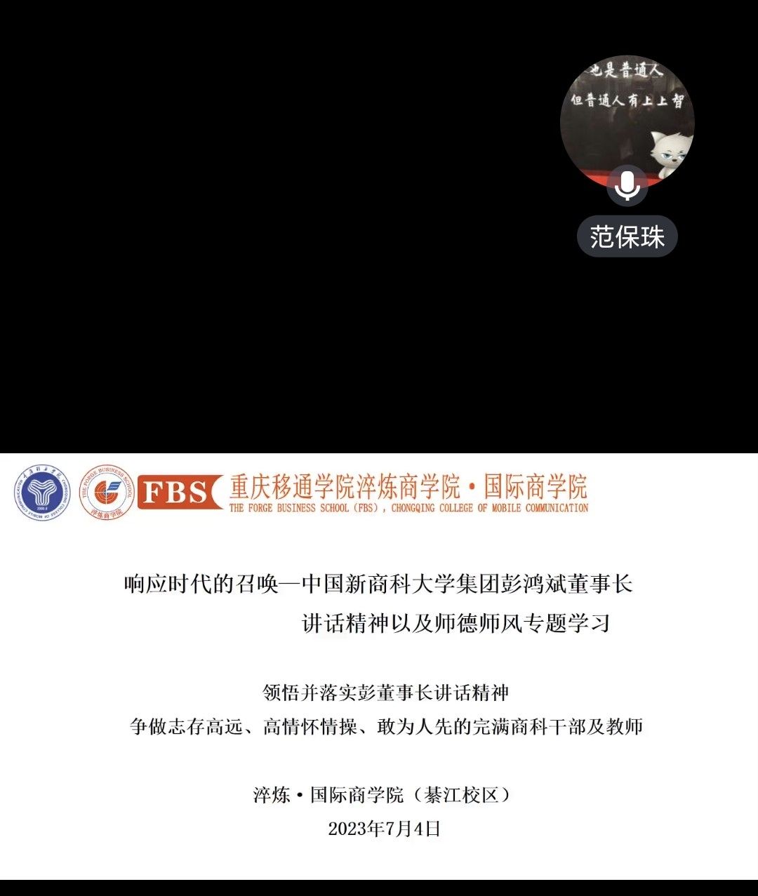 7月4日下午15:00,綦江校区淬炼·国际商学院组织全体教师通过线上会议认真学习了集团董事长彭鸿斌博士《响应时代的召唤》的讲话精神以及师德师风。会议由商科认知教研室主任杜嘉主持,全体教师参与学习交流。