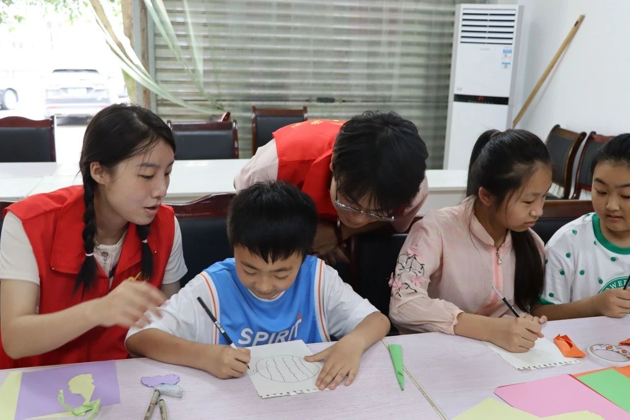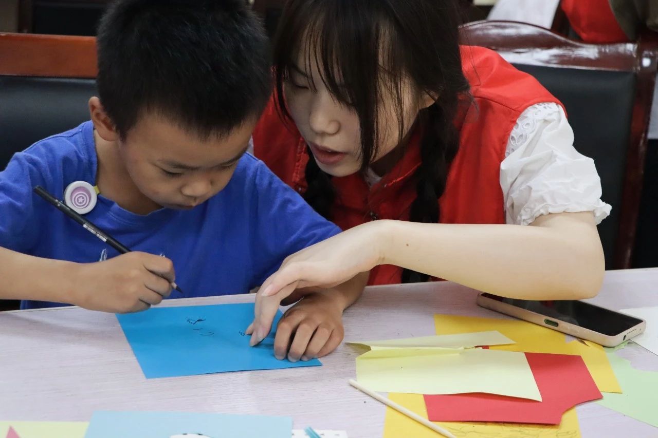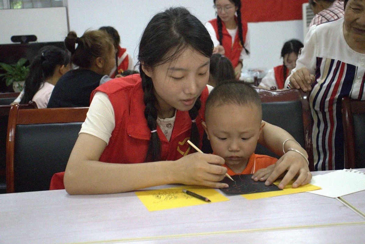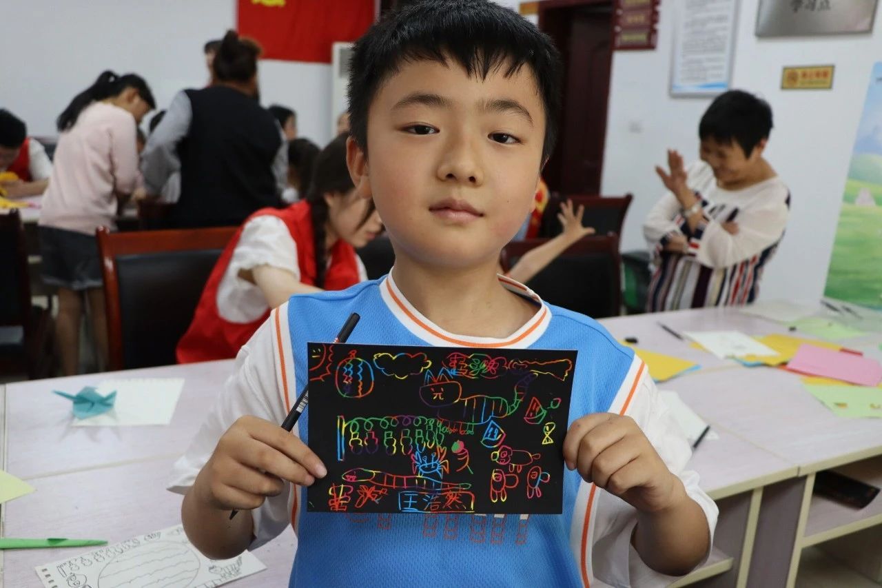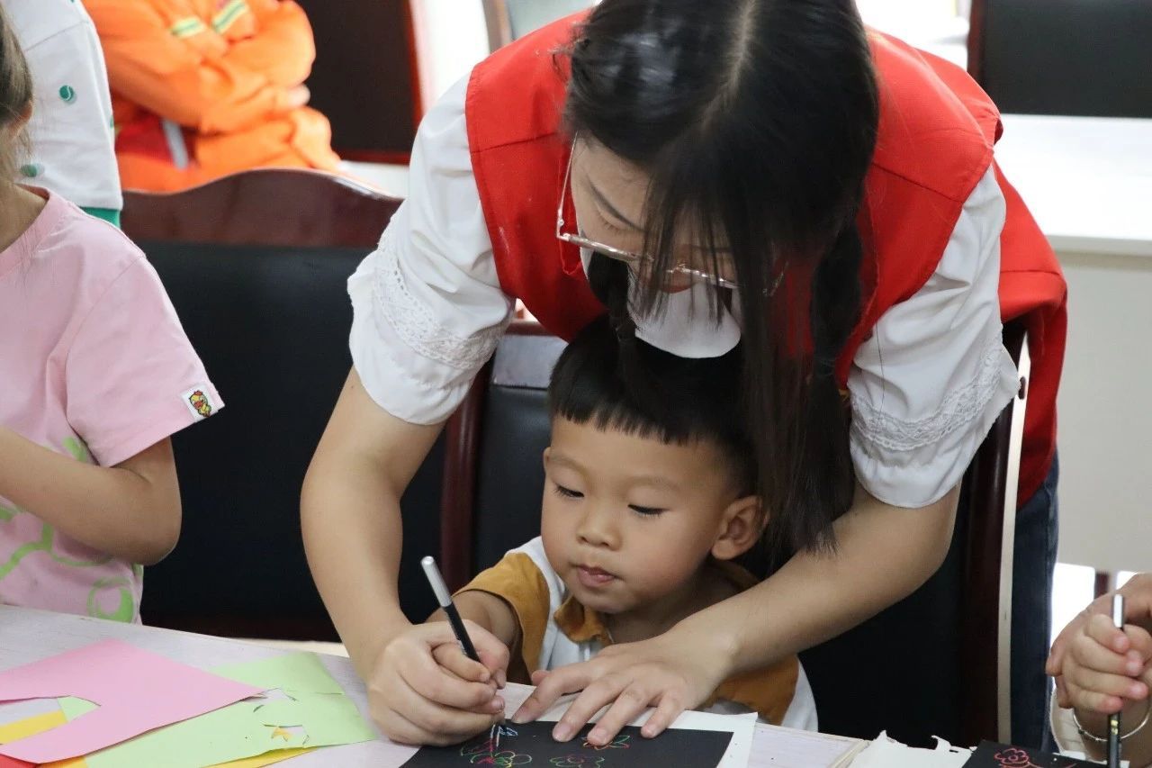 通过前面几天的三下乡活动,服务团对社区小朋友的喜好和兴趣有了一定的了解,为了照顾到不同年龄段的孩子,志愿者们采取了剪纸、折纸、刮画、水彩画等多种形式展开艺术课堂活动,有针对性地进行差异化教学,用生动有趣的引导为小朋友们科普艺术文化知识,让小朋友们都能找到自己喜欢的“绘梦”方式,去大胆绘制自己的梦画。