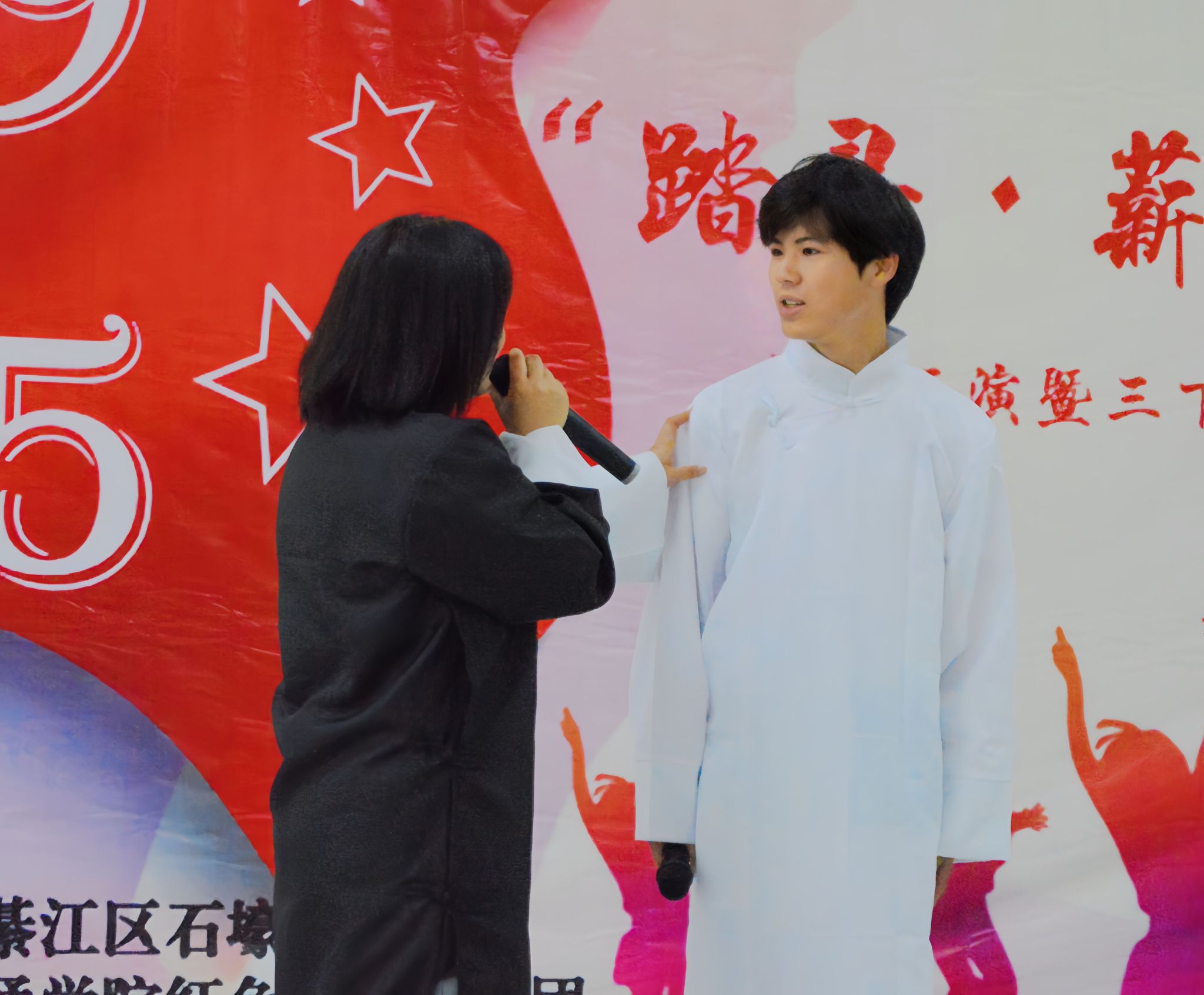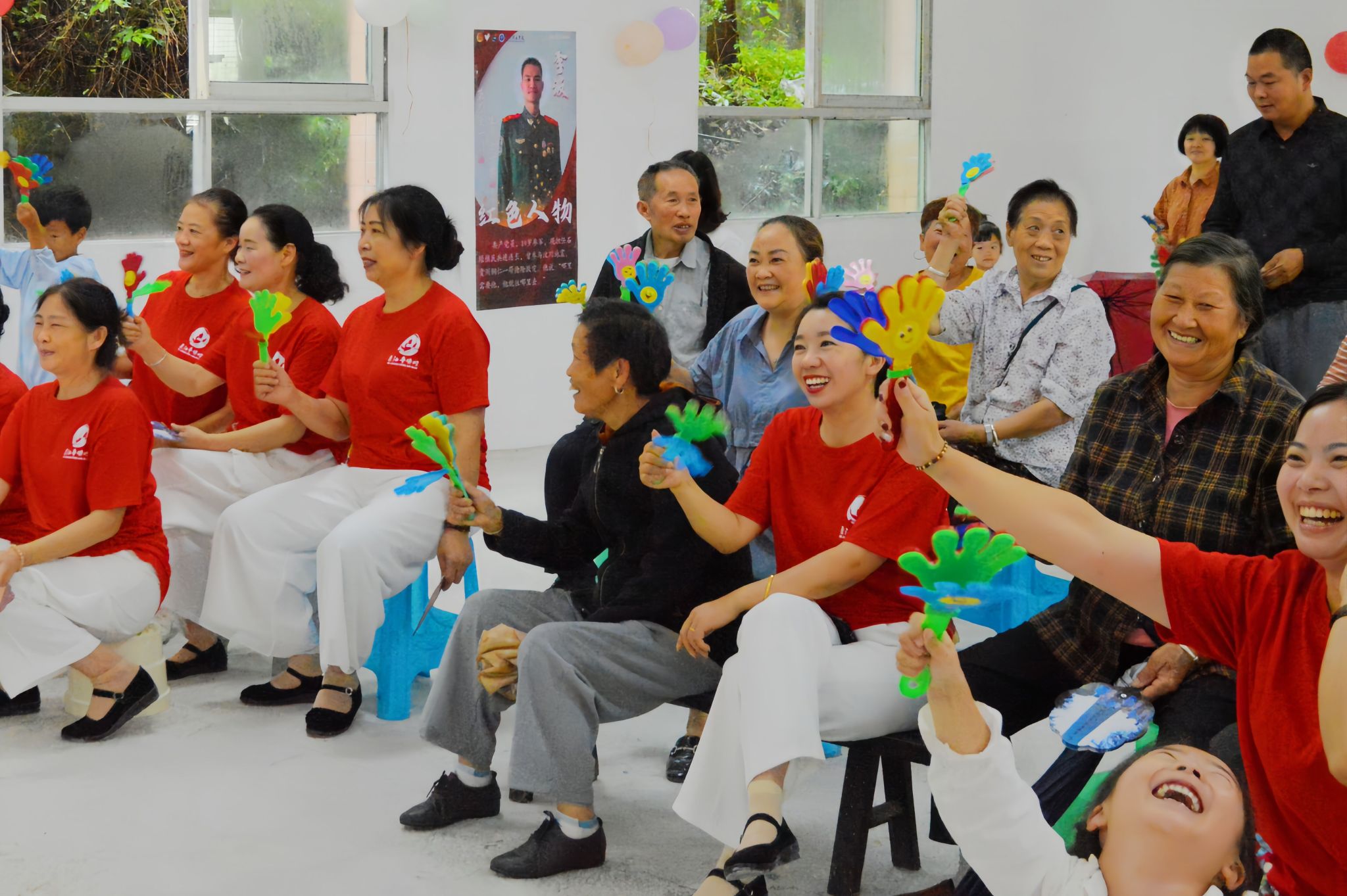 首先登场的是石壕镇阿姨们的舞蹈表演。她们身穿鲜艳的舞蹈服装,以自信的姿态,优雅地舞动着身姿,向观众展示她们的活力风采。礼堂里洋溢的热闹氛围,为文艺汇演带来不一样的温暖与活力。礼堂摆放着一排排整齐的椅子,小孩子跳跃着,释放出熊熊的热情。舞台两旁的海报象征着老一辈对红色文化的传承,这些海报也激发着乡亲们对于红色文化的热爱与追求。紧接着是红色信使寻访团成员带来的《XIN语XIN说》相声表演,成员以幽默搞笑的方式讲述一些红色经典故事,以及石壕镇的发展变迁。他们的表演不仅仅为观众带来欢笑,更重要的是通过相声的形式,传递红色文化和社会主义核心价值观。