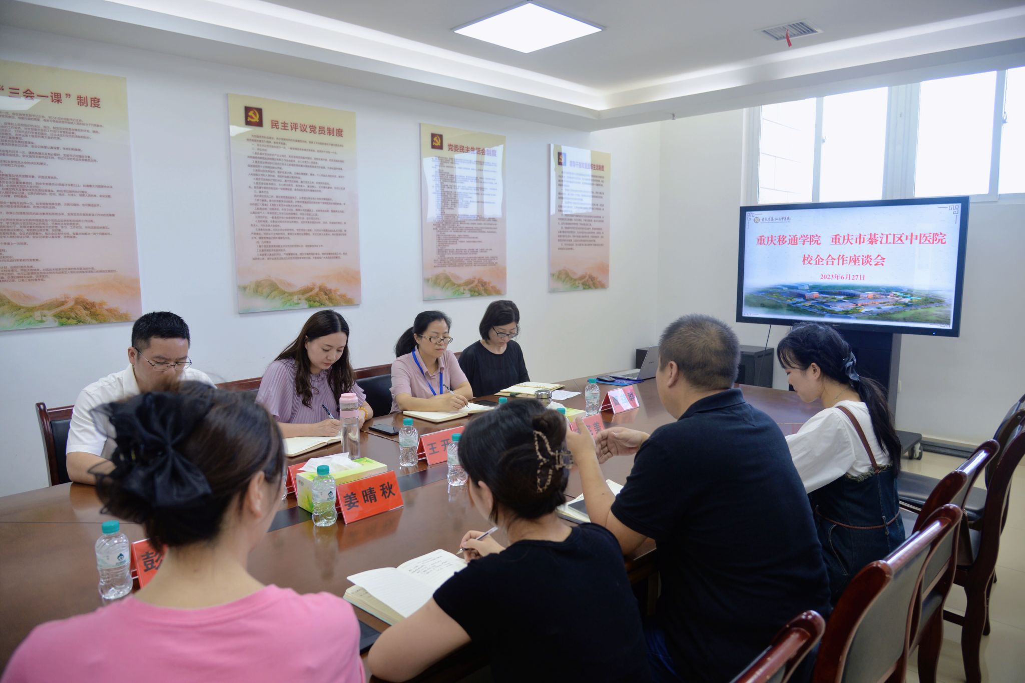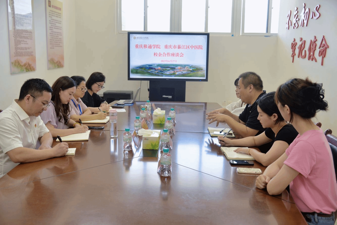 首先开展了重庆移通学院与重庆市綦江区中医院校企合作座谈会,参会人员有王开莉副院长、护理部帅永开主任、治未病科外联负责人曹益群主任、治未病科梅雪峰主任,林毅院长、姜晴秋老师、汤宪美老师、彭丽珺老师。王开莉副院长对大健康管理学院教师的到来表示欢迎。林毅院长真挚地向重庆市綦江区中医院促成此次访企拓岗专项行动表达谢意。对大健康管理学院的发展现状、专业设置、未来发展方向做了初步介绍。针对校企合作访企拓岗的重要性及必要性,林毅院长向中医院各参会专家讲述了学院对今后合作的初步设想,主要从六个方面推动校企合作:第一,邀请中医院的专家每月进校开展一次讲座或专题报告,内容能够与学生专业紧密结合,从学生感兴趣的角度出发;第二,医院专家走进课堂,与专业教师协同完成一门专业课程,侧重于实践课教学;第三,学院与中医院专家共同探讨培养方案的制定,与时俱进,不脱离社会发展;第四,共同研发特色课程,为学生就业增加核心竞争力;第五,共同开发线上课程,在保证教学质量的同时高效利用师资力量;第六,推进专业实验室的建设工作,与社会前端技术保持步调一致。王开莉副院长对以上六项初步设想表示认同,提到中医院有足够的专家学者能够担任以上工作,关于具体细节需要双方在会后进一步沟通形成书面合作协议,在向大健康管理学院教师详细介绍了綦江区中医院的同时播放宣传片让綦江中医院的形象深入人心。