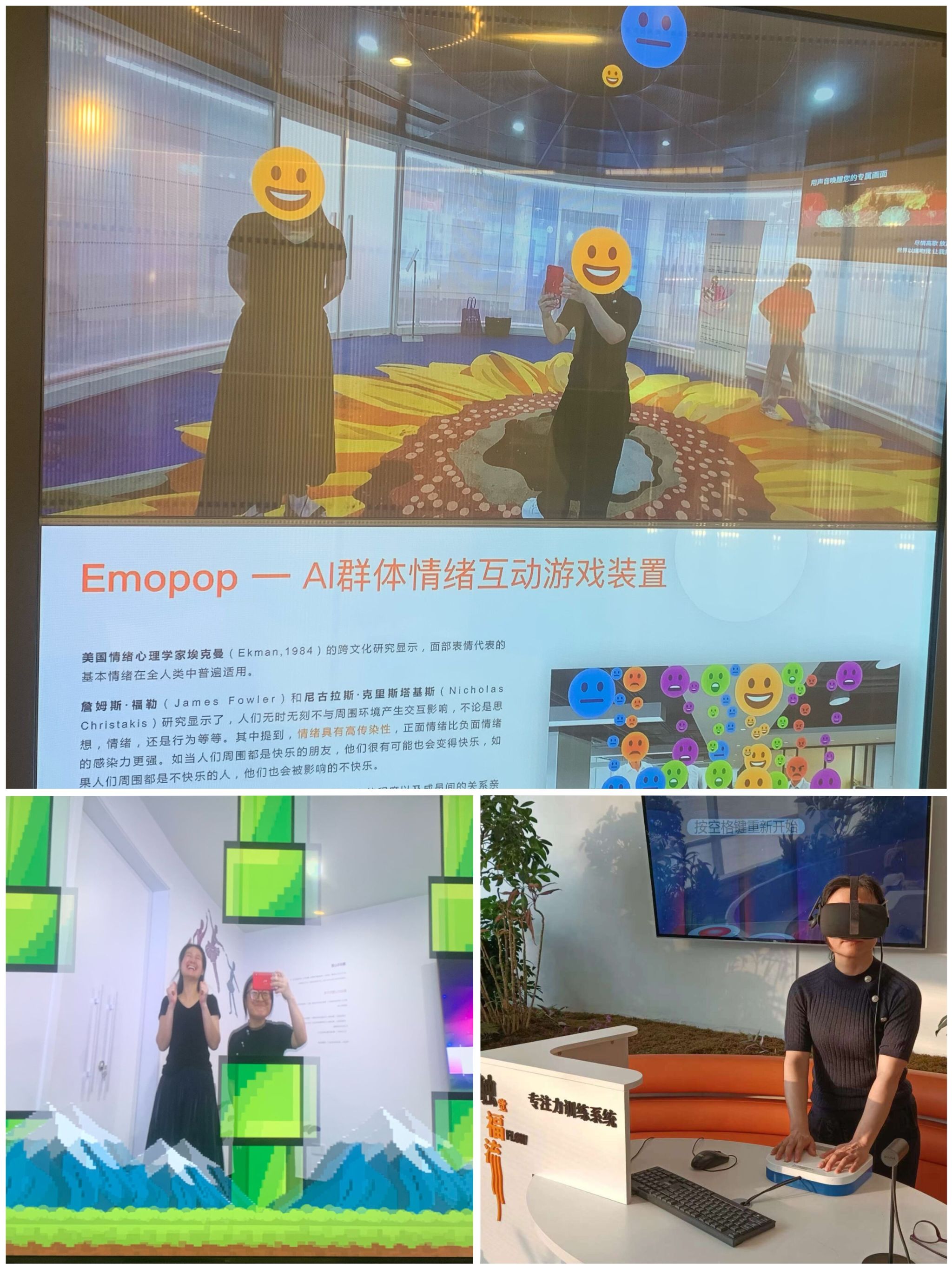 两位老师跟着讲解员开始体验幸福之旅。一楼主要为视、听、嗅、触、味等五感体验区。嗅觉体验装置中有很多源于自然的气味,引发人们积极的情绪。科学馆二楼、三楼内有各类运用高科技的人工智能设备,它们可以帮助睡眠障碍人群快速放松疲劳,可以训练人们的专注力,帮助人们释放心理压力,个个都是“心理+科技”的代表作。