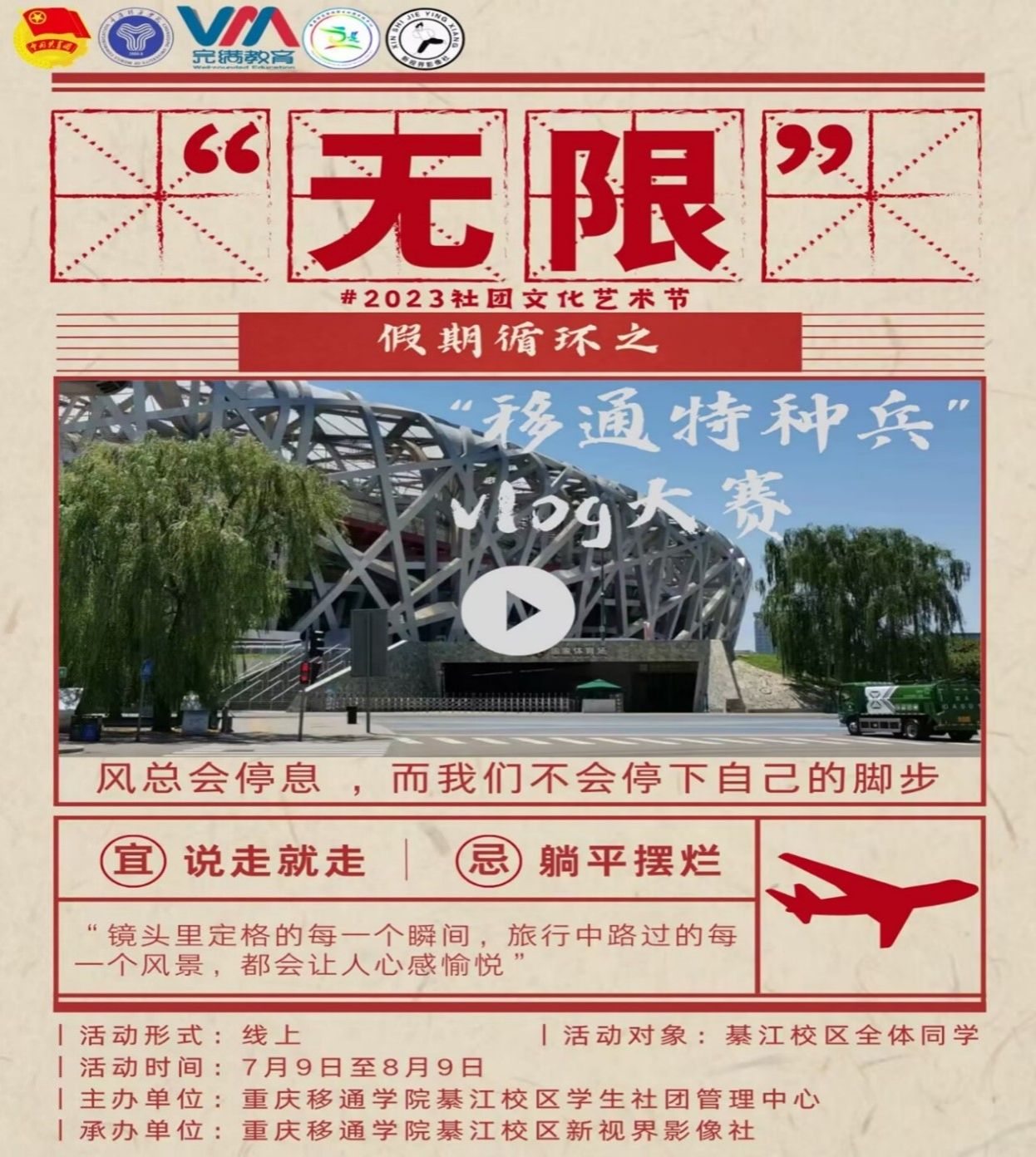用镜头记录生活,用心发现热爱,“能拍就拍,大胆记录,相机定格住的琐碎是散着光的繁星”。为引导同学们积极的记录暑期生活,展现假期最真实的自我,保留最热烈的青春。7月9日新视界影像社举办了“无限”假期循环之“移通特种兵vlog大赛”线上活动。此次活动共有四个板块,分别是“旅游特种兵”“学习特种兵”“打工特种兵”“综合特种兵”,活动一经发出就吸引了大批“特种兵”的参与。此次活动还设置了八个奖项,让同学们在记录暑假美好生活的同时还可以获得独属于自己的“生活奖章”。