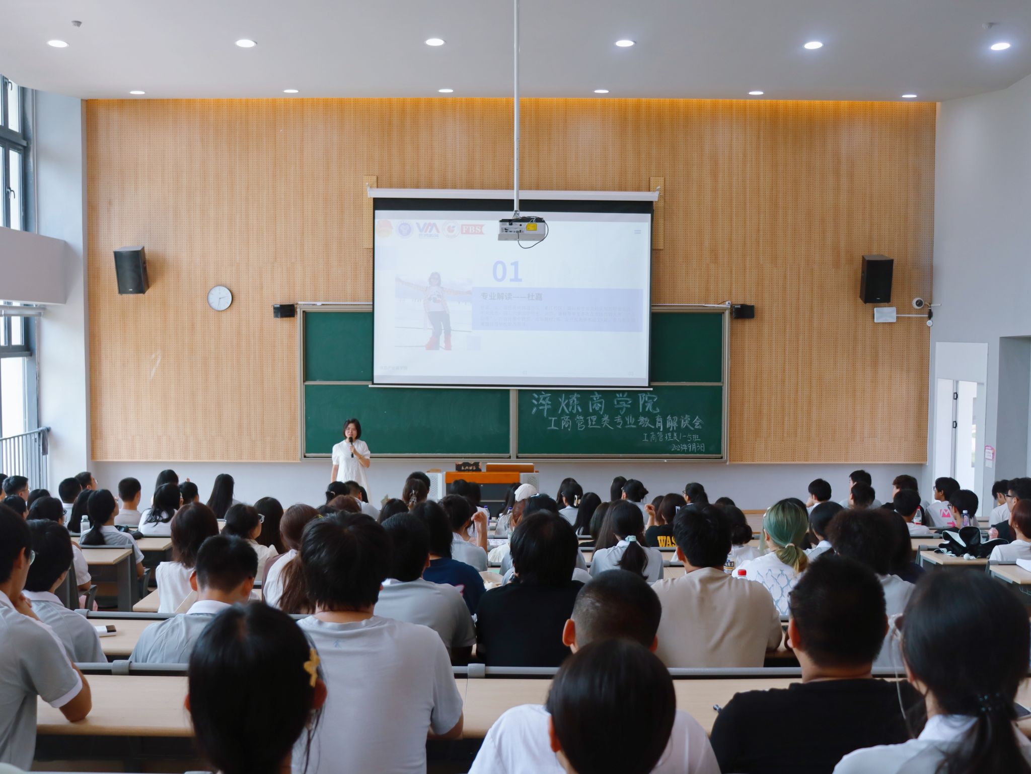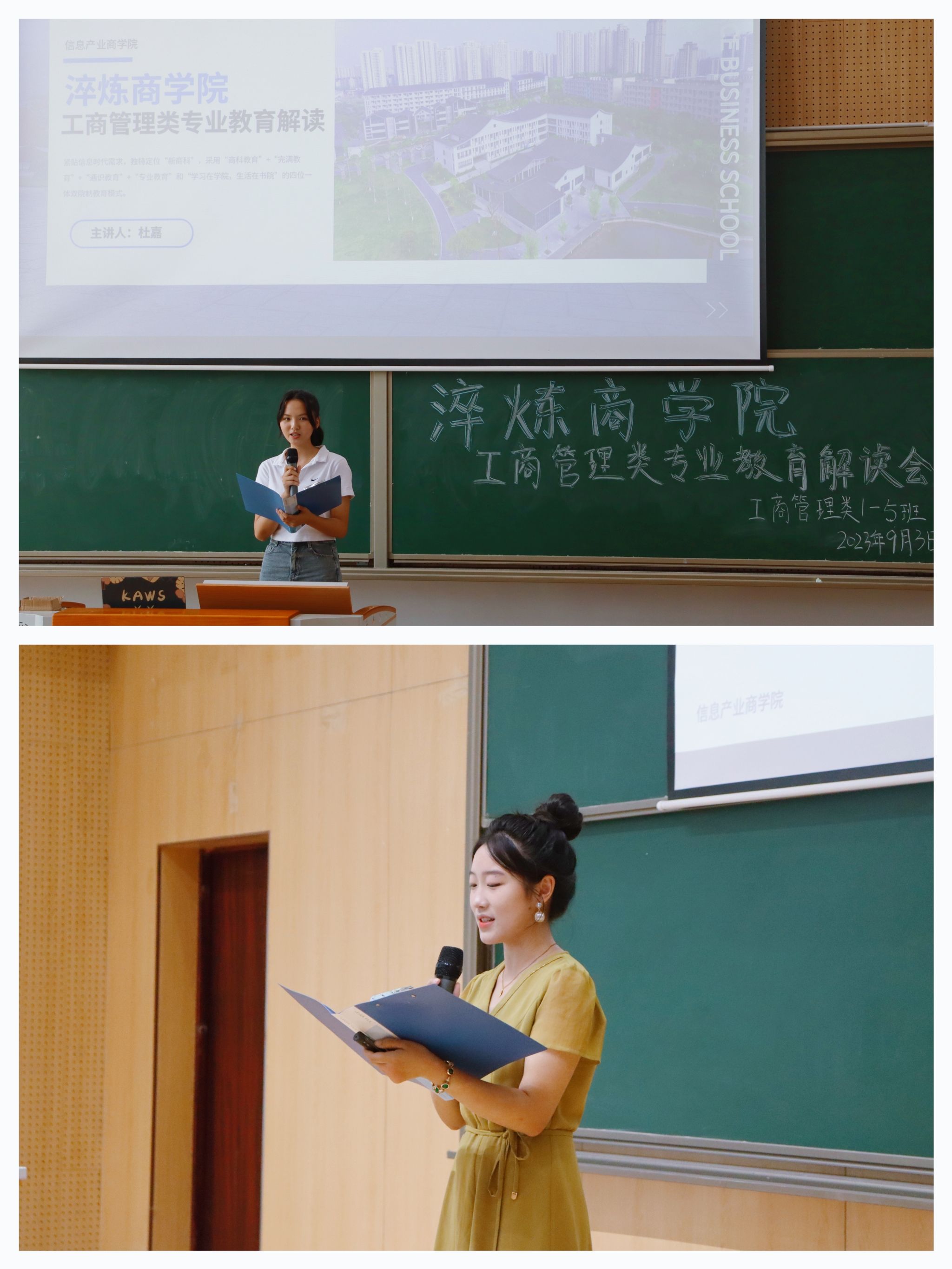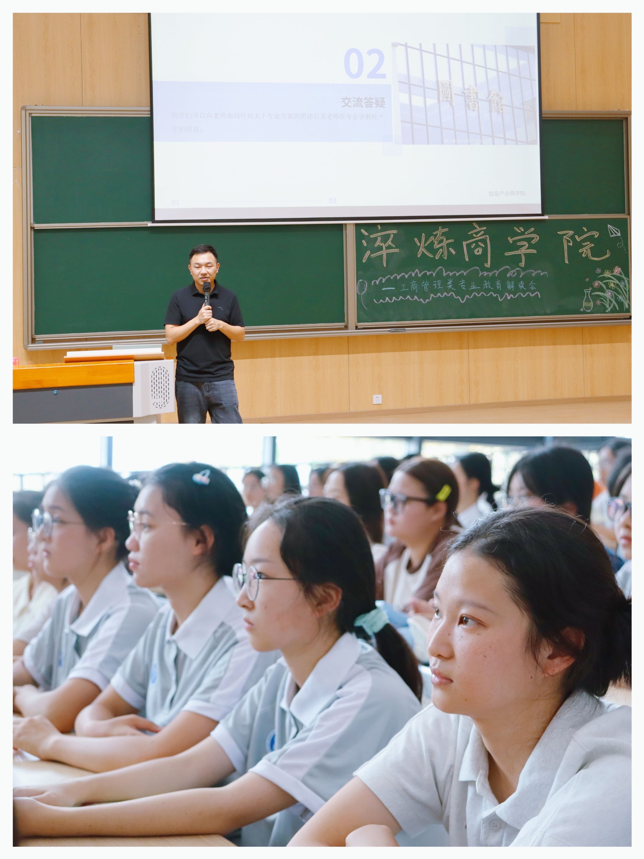 为引导学院2023级新生尽快适应新环境,帮助学生全面了解淬炼商学院和工商管理类专业以及专业分流情况,明确学习目标、培养专业情怀、理解专业内涵、坚定专业自信,淬炼商学院(綦江校区)于2023年9月3日分别在玉堂书院阶梯教室和横山书院阶梯教室开展了2023级新生专业解读会。本次解读会有幸邀请到商科认知教研室主任杜嘉老师、专任教师陈冰川老师出席,为新生们讲解专业前景等内容。