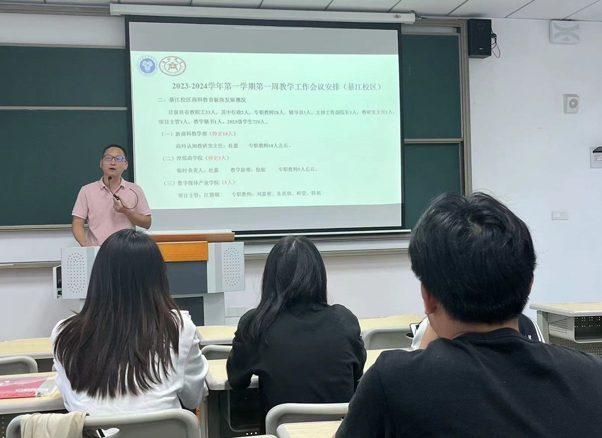 为确保新学年新学期教育教学工作平稳有序,9月6日下午4:00,綦江校区商科教育板块2023-2024学年第一学期第一周教学工作会议在智者楼202教室召开,部署新学期教学工作。会议由副院长范保珠主持,綦江校区全体教师参会。会议主要议程有新教师相互认识、綦江校区商科教育板块发展概述和其他相关工作部署。