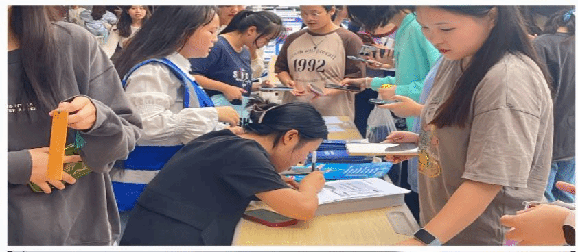 活动现场,协会的干部干事、志愿者、安稳办的工作人员和民警一起指引到场的同学们通过“中国大学生在线”公众号有序作答并发放了有关防诈的宣传彩页、手册。广场上展览网络安全手抄报、网络安全教育宣传倡议书展板以及设立咨询台,到场的民警也向同学们科普基本的网络安全防范知识,为大家答疑解惑。