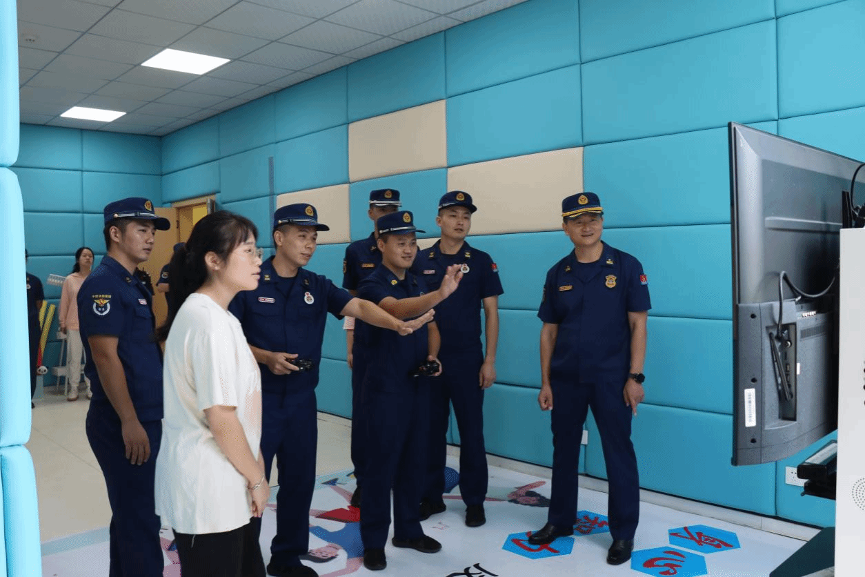 消防员参观队伍来到心理体验中心,林红老师与一名朋辈心理咨询员向消防队员们逐一介绍各项心理疏导设备,引导队员参加体验,通过歌声、肢体运动释放消防队员工作压力,减少心理负担,现场氛围融洽,在参观体验过程中消防队员感受到学校系统、专业的心理健康服务和良好的环境设施条件。