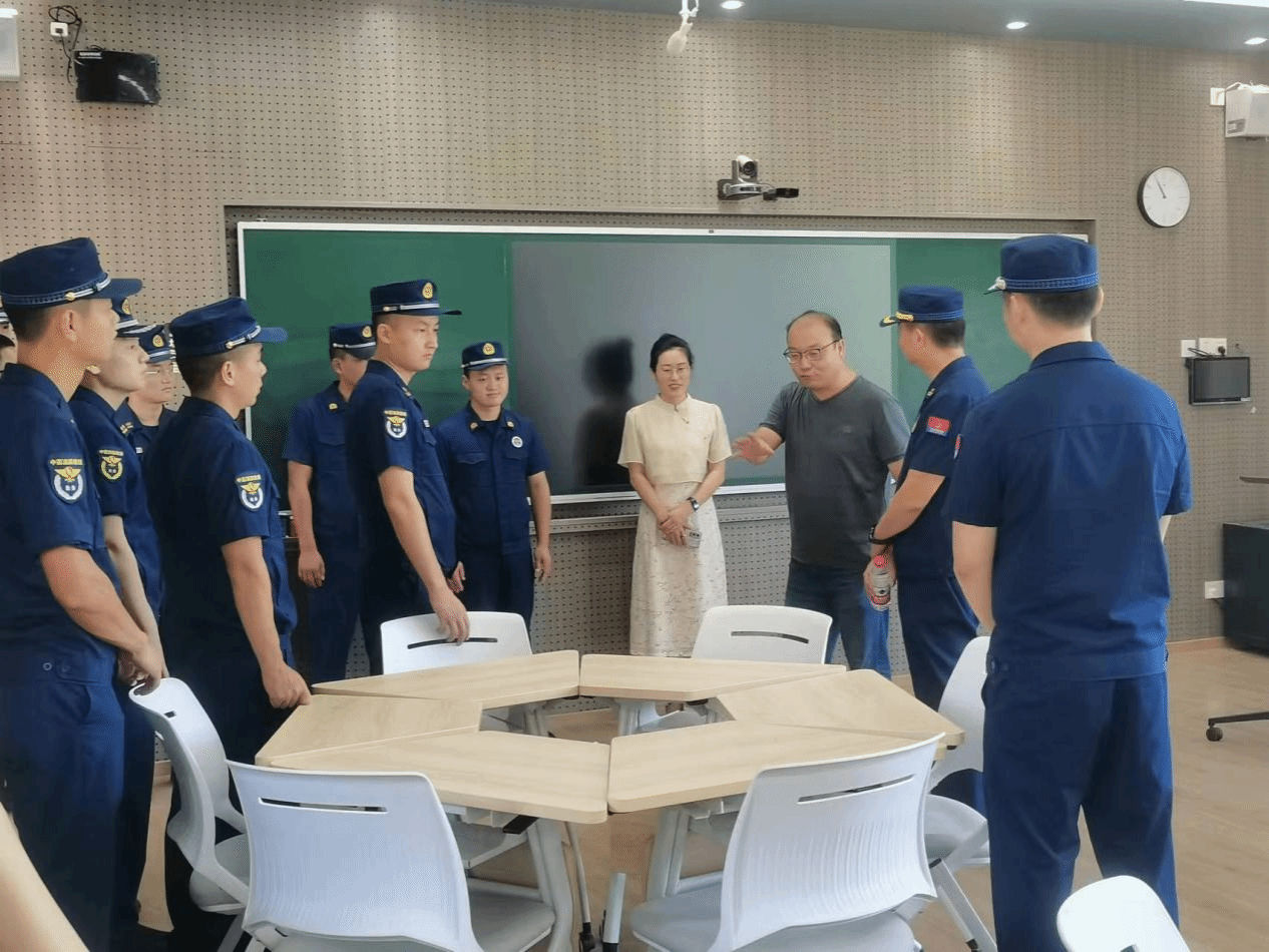 参观远景学院过程中,学院院长强杨、学工办主任郭淼老师带领消防队员们参观电影教室、智慧化研讨教室、智者讲堂等,介绍学院灵活多样的授课环境,启发式、互动式、探讨为主的学思结合教学形式,和培养具有通识知识、专业知识、交流能力人才的目标。让消防队员们感受到学校创新育人思路和育人理念。