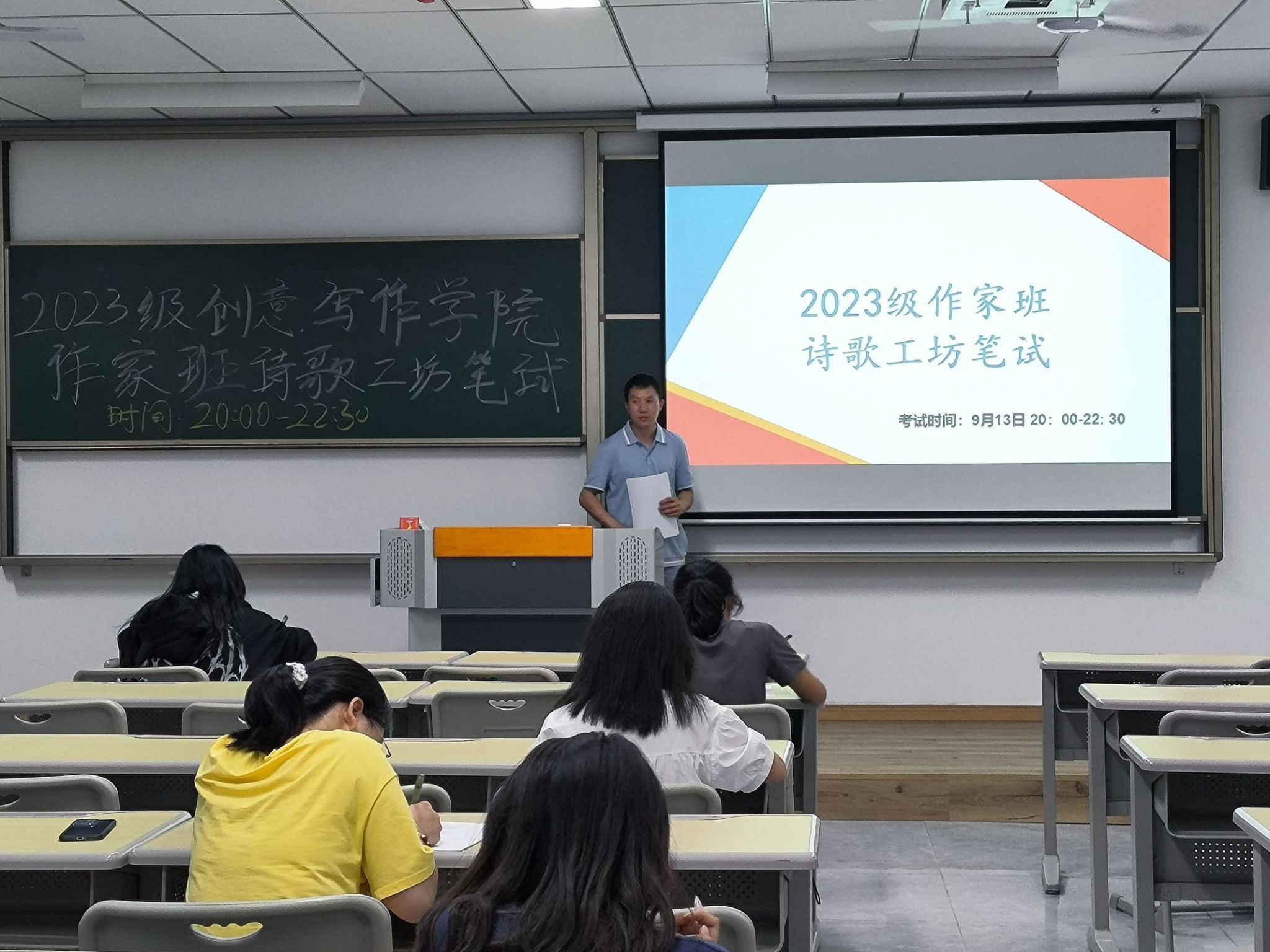 13日晚上9点的笔试,行者楼2楼所有教室都成了考场,有的考生早早就来到考场,很淡定地坐在那里沉思,有的考生在各个考场门口探头探脑,犹豫着到底进哪个考场,也有一些考生请求老师,能不能提前透露一点题型,以便自己多酝酿一下。当晚的笔试,主要是考灵气,考文学想象力,至于有没有文学功底不是最重要的,首先要有闯进作家班的强烈意愿和气势。有个叫李云沁的女生,踩着秒针冲进考场,然后,仰靠在椅子上大口喘粗气,令人动容。当晚笔试现场特别火爆,导师们抱着收回的考卷,个个笑开了怀。