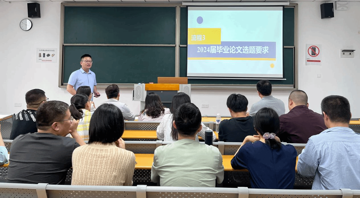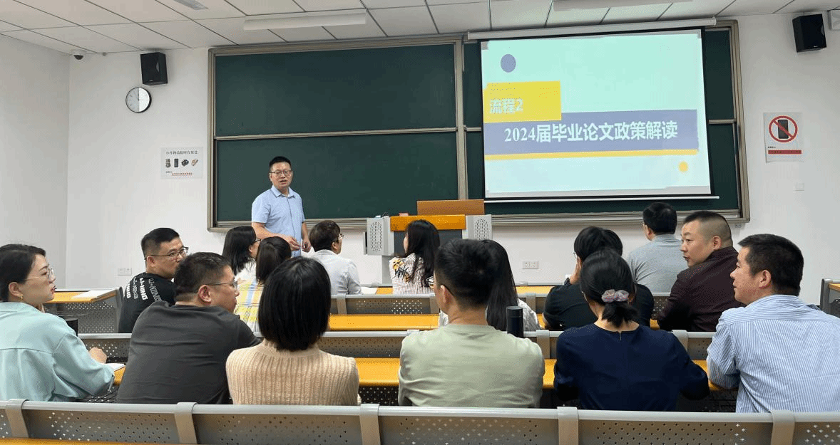 会议伊始,吕院长介绍了参与本次会议的重要教师。接着闫会峰院长对2024届毕业论文政策作了相关解读,为各位教师们详细解读了关于本科论文指导工作流程和注意事项,并强调:“毕业论文是本科教育的重要实践教学环节,是衡量教学管理水平和教学质量的重要依据。各位老师要明确质量要求,严把质量关,以高度的责任感做好检查工作,提升本科生毕业论文质量。”