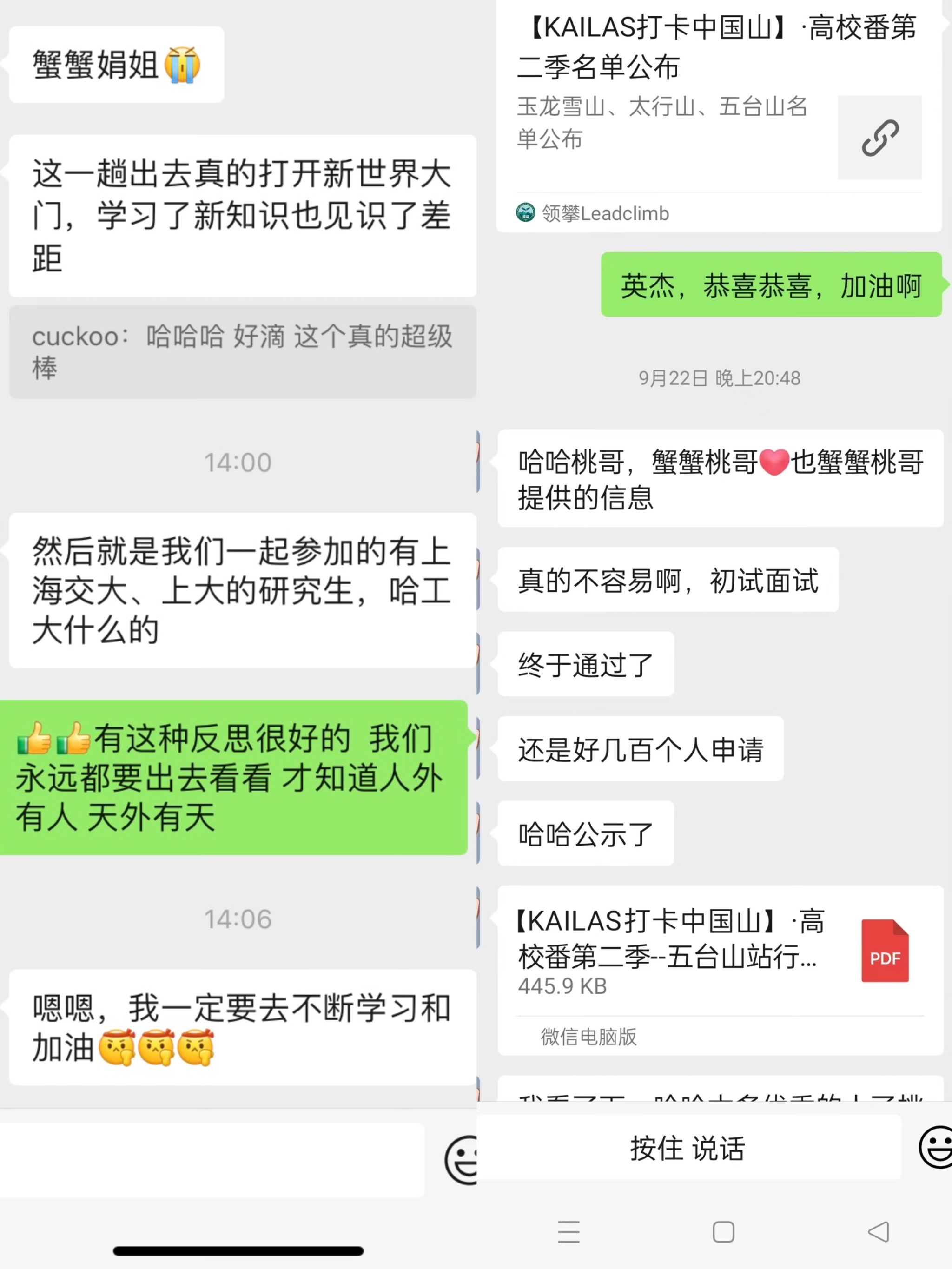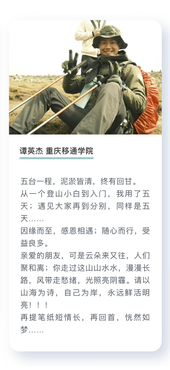 与风与云向山海走去,以诗以歌与年华相和。10月5日,我校迷彩俱乐部成员谭英杰同学作为重庆地区唯一一人参加“KAILAS打卡中国山”高校番第二季(山西·五台山)活动,并顺利挑战成功。