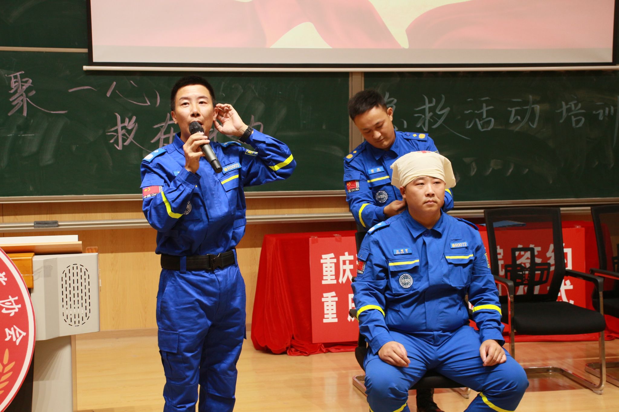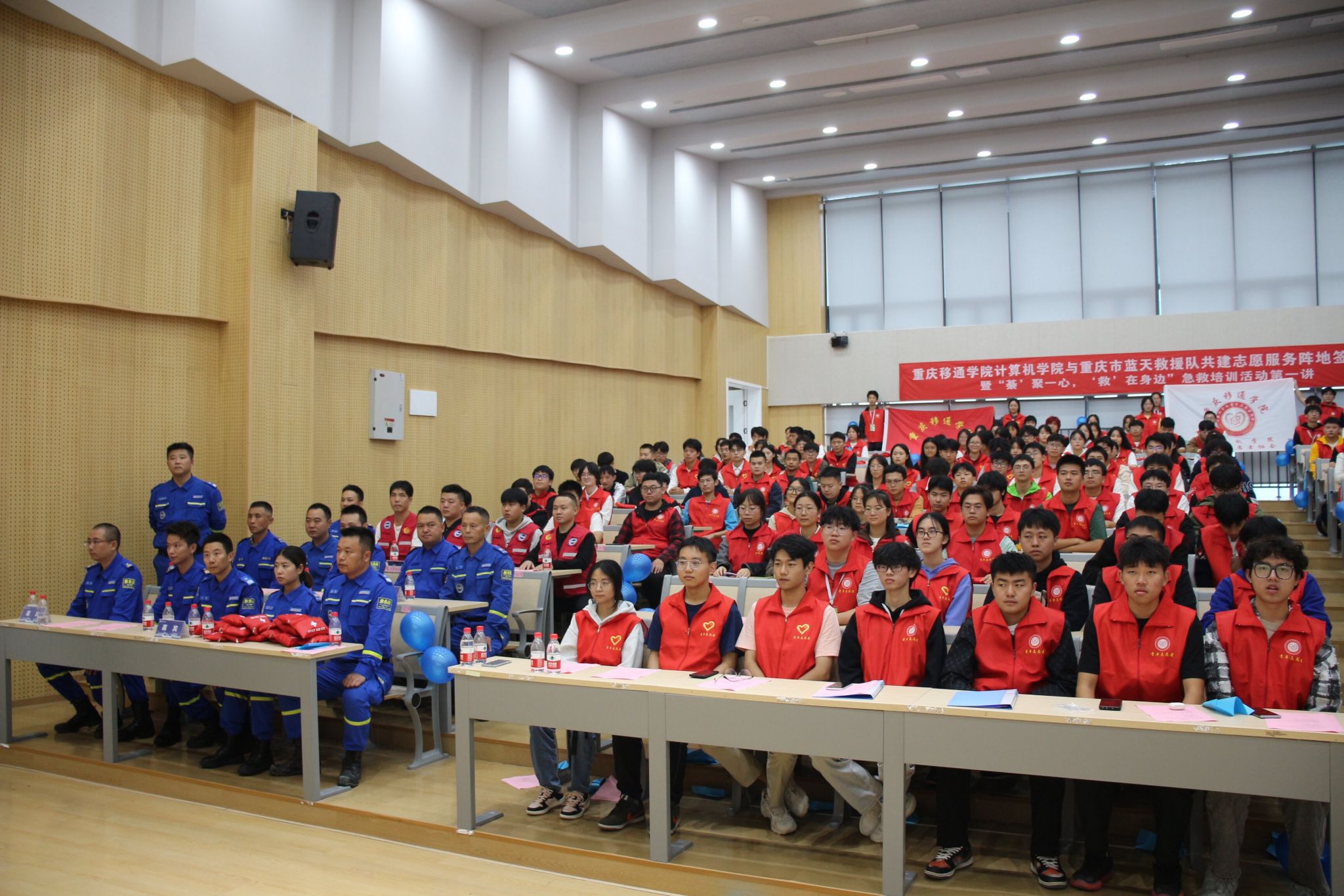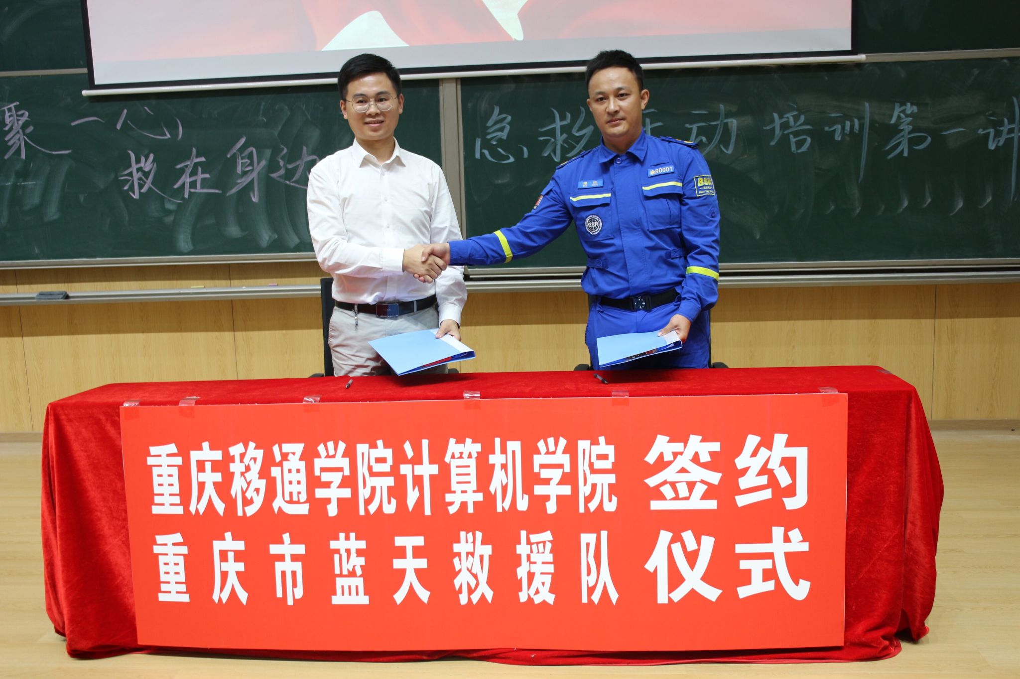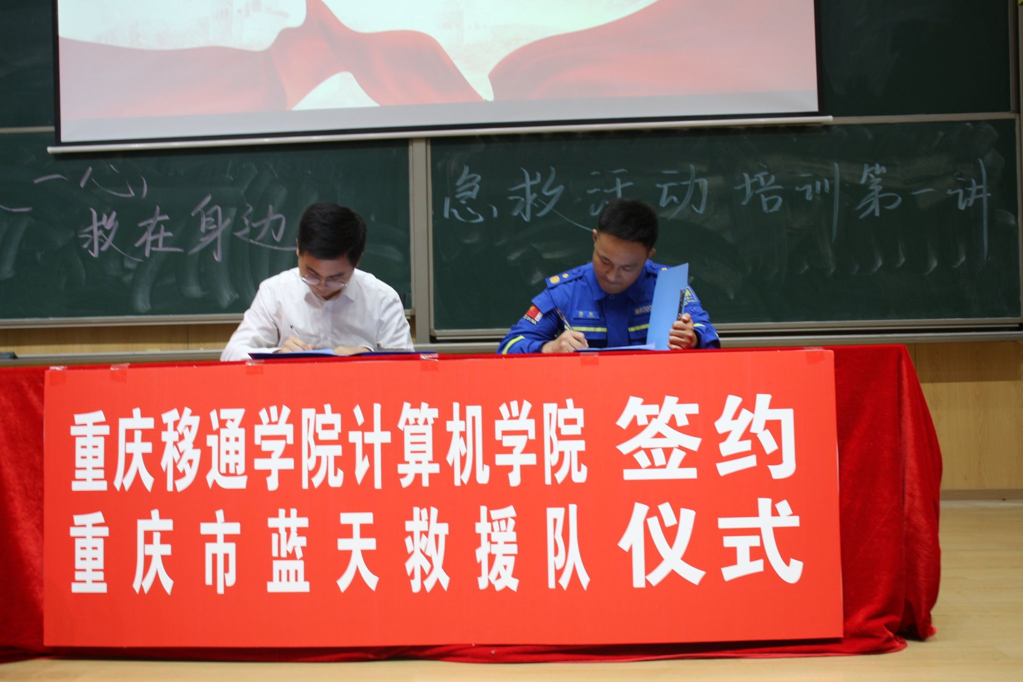 为促进青年志愿者与救援队伍之间的合作与交流,增强我校师生的救援意识和能力,我校计算机学院与重庆市蓝天救援队于10月13日下午14:30在玉棠书院阶梯教室举行了签约仪式暨“‘綦’聚一心,‘救’在身边”急救培训活动第一讲。旨在通过此次活动普及急救相关知识,提高全校师生应对生活中突发的紧急情况的能力。参与此次活动的嘉宾有计算机学院辅导员,计算机学院学工办主任谢沅红,校团委以及各个学院志愿服务指导老师,保卫处李小伟老师,学生工作处(武装部)勤工助学中心副主任温宗航,计算机学院学工副院长周俊,重庆市蓝天救援队队伍。