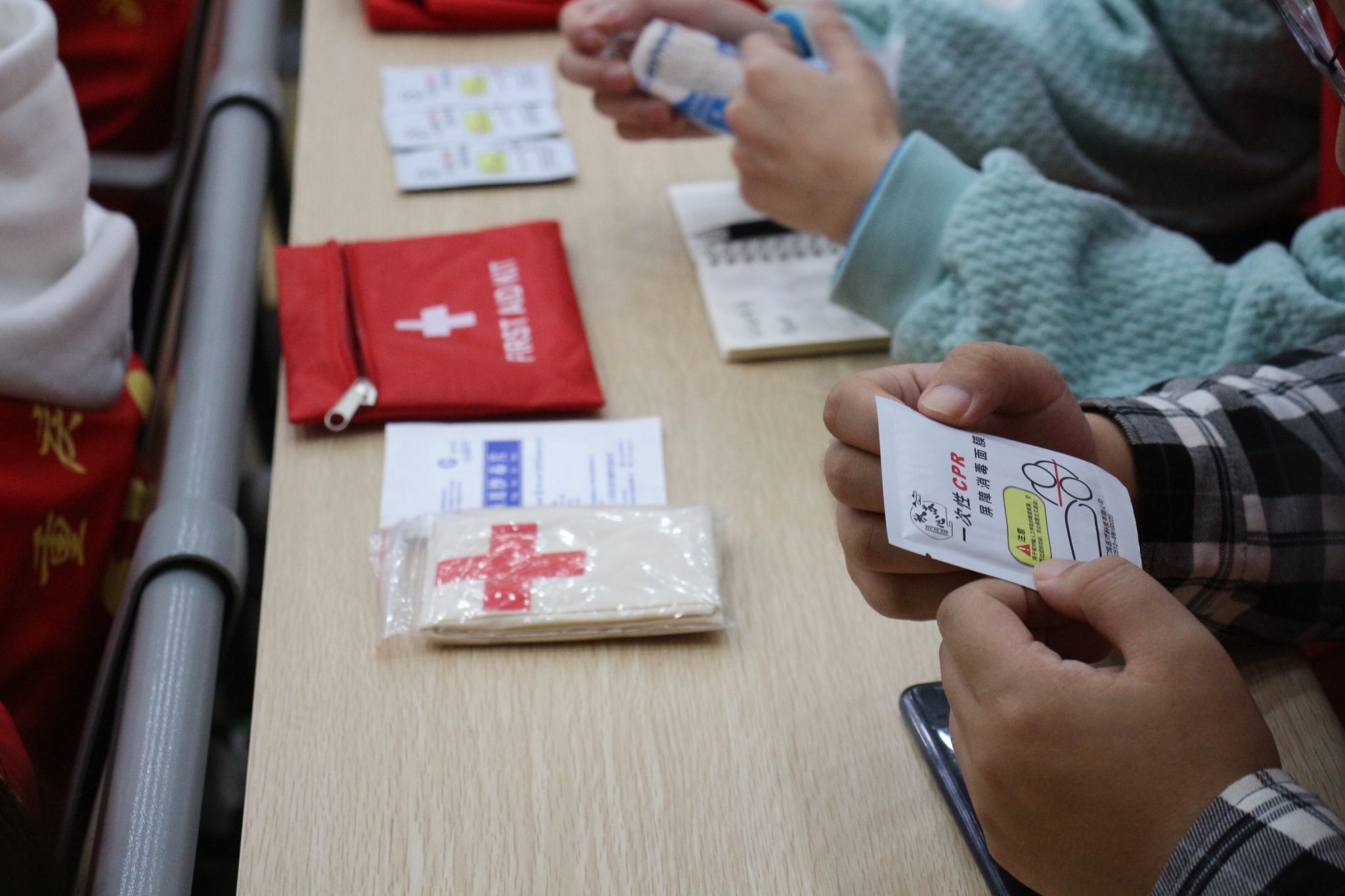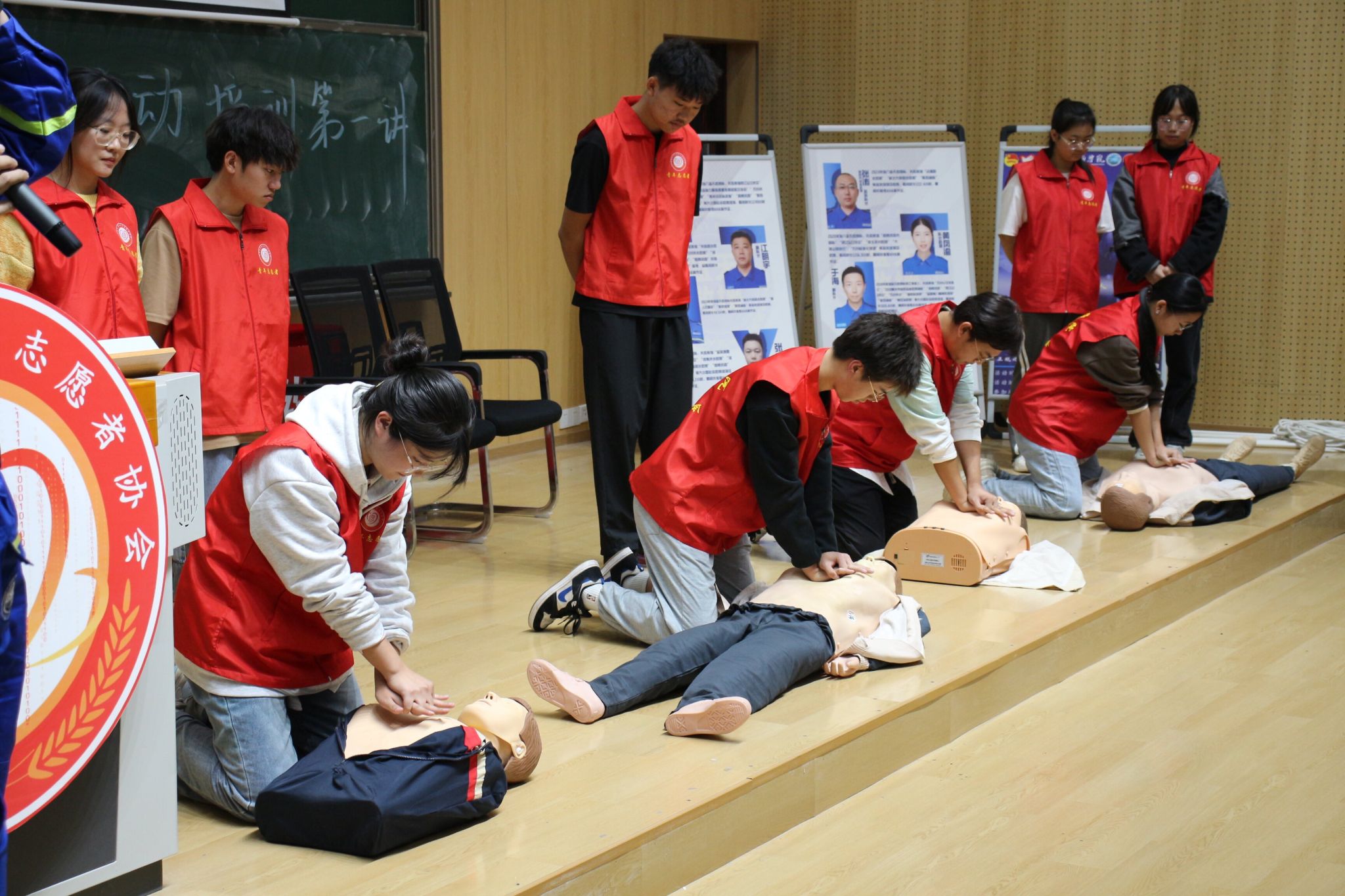 签约仪式步入尾声,“‘綦’聚一心,‘救’在身边”急救培训活动第一讲也即将开始,蓝天救援队副队长于海为志愿者们准备了急救包,他在台上讲解急救包的使用,台下的志愿者们认真地学习着应急包扎的正确方式。随后,蓝天救援队队员们为志愿者们讲解用绳索,衣服,竹竿制作简易支架的流程,并随机抽取志愿者上台进行简易支架的制作。其他队员为大家讲解了心肺复苏的正确方式,为大家演示完胸部按压之后,又演示了如何清除口腔异物。志愿者们踊跃上台实践,于海副队长也对大家的一些误区提出改正。本次活动通过理论讲解、示范操作、现场演练等形式,向大家积极传播急救理念和应急救护技能,增强应对突发事件的现场处置和自救互救能力。