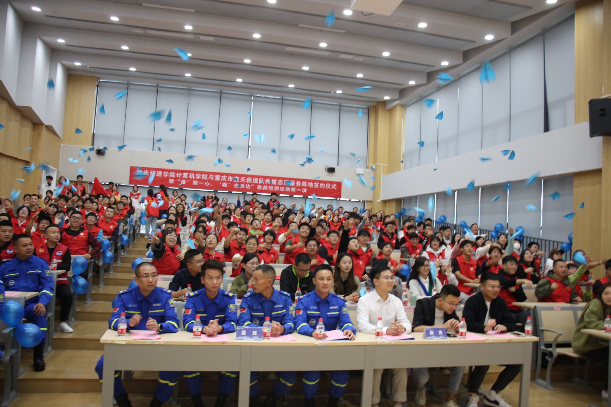 仪式进入高潮,在场的志愿者们放飞桌上的蓝色纸飞机,双方代表上台签约并握手合影,这代表着重庆市蓝天救援队(綦江)与我校计算机学院正式达成了共识,共建志愿服务阵地,为我校志愿服务注入了新的血液,促进了我校志愿服务的进一步发展。为加强合作,各位领导,老师们和蓝天救援队进行深入探讨与交流,他们都对合作满怀憧憬,充满自信。
