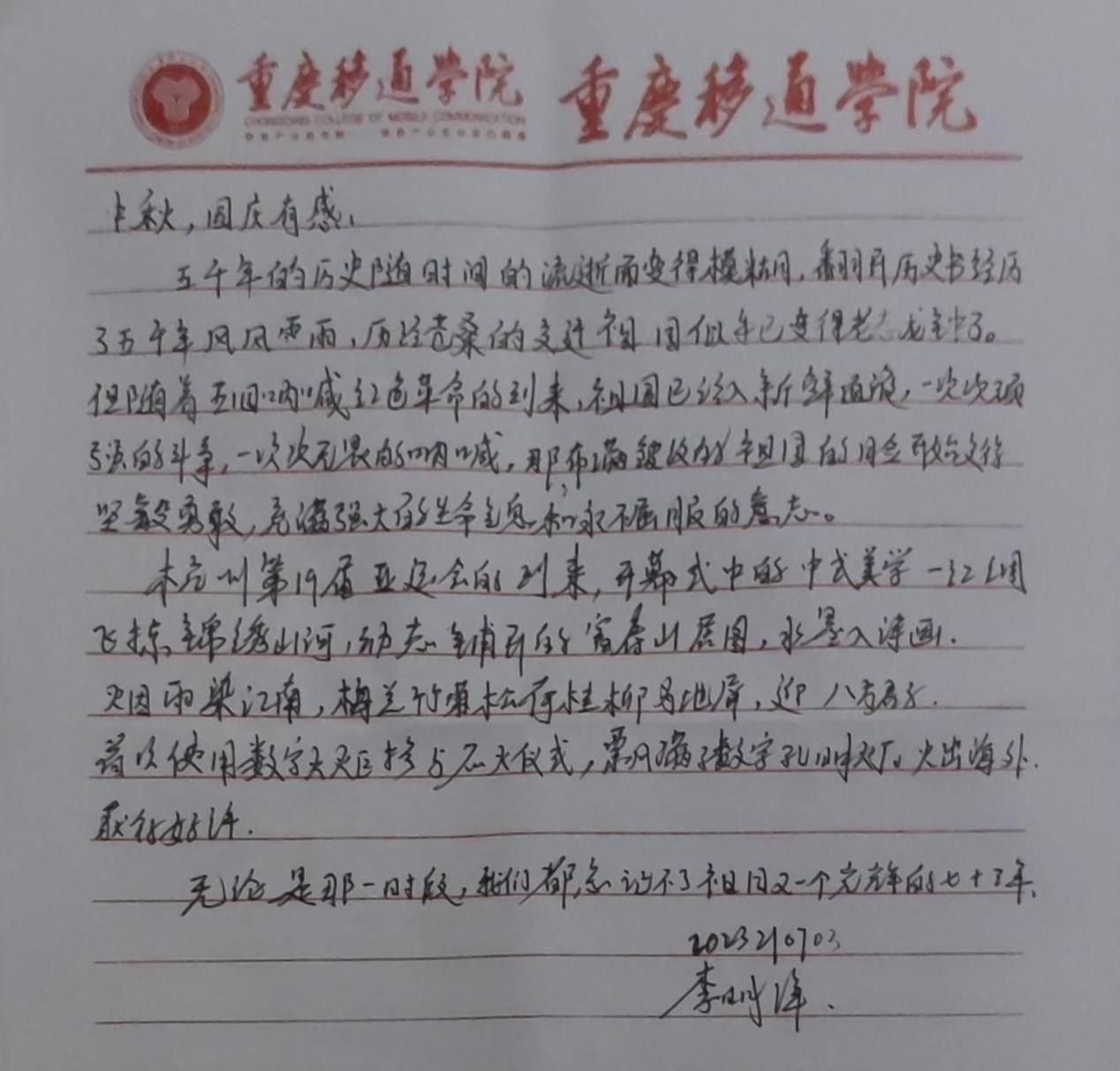 活动开展前期,积极利用网络资源对活动进行宣传。在活动开展期间以信件的形式收集活动参与者的感言语录,活动在社团成员的配合下有条不紊地进行,同学们积极参与,纷纷用自己的笔描绘对祖国的热爱之情。