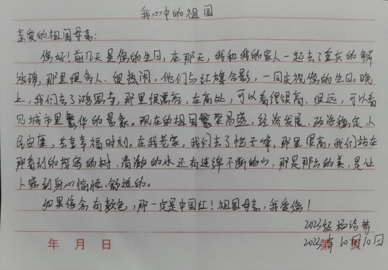 以下是部分同学的作品:“祖国,是我们的母亲,哺育了我们成长。我们要努力学习,为祖国的繁荣富强贡献自己的力量。”“祖国的伟大历程,是一部波澜壮阔的史诗。我们要传承中华优秀传统文化,为实现中华民族伟大复兴的中国梦而努力奋斗。”“祖国的山河壮丽,人民团结奋进。我们要为祖国的美好明天而努力拼搏,为民族复兴贡献自己的一份力量。”同学们用真挚的语言描述着对祖国的热爱。