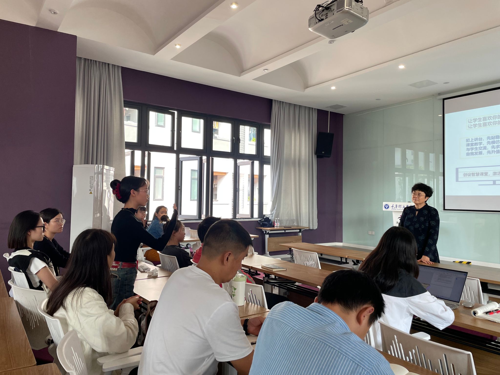 在交流互动环节,参训老师们根据自身实际情况,提出了课堂教学管理环节中的困难和个人能力提升方面的困惑,积极地向李长萍教授虚心请教。