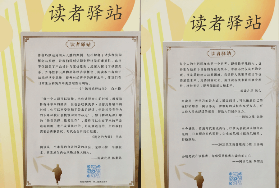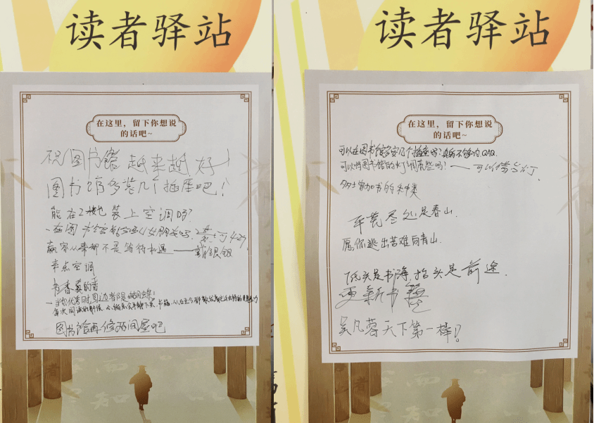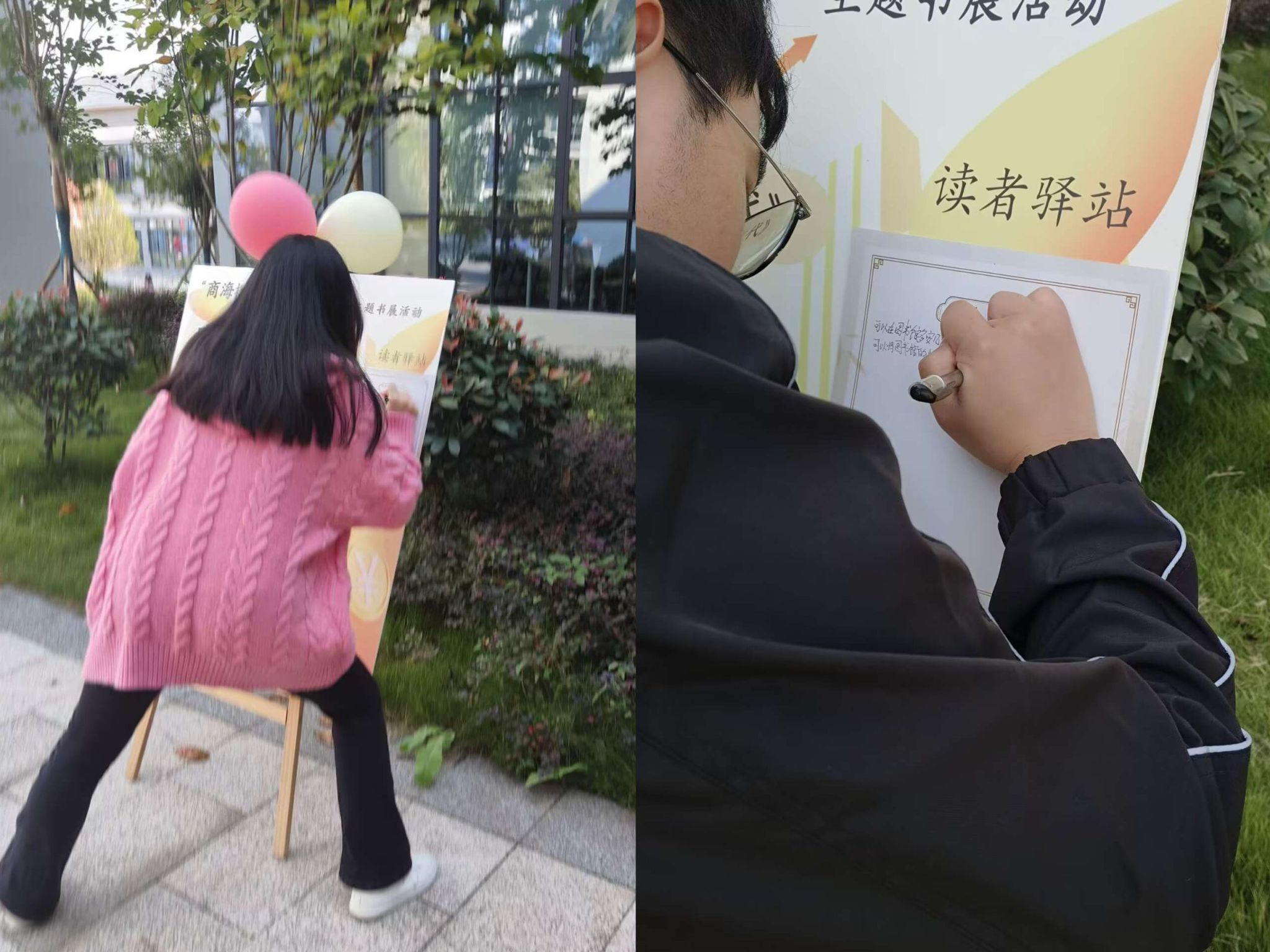 为进一步促进读者间的交流与互动,为师生读者搭建一个不为时间、空间所限的沟通桥梁,我们在本次活动展板中设置了“读者驿站”。活动过程中,大家非常积极活跃,都很乐意分享自己的读书技巧以及内心对各自喜爱书籍的心得与感悟,在“读者驿站”留下了自己浓墨重彩的一笔。