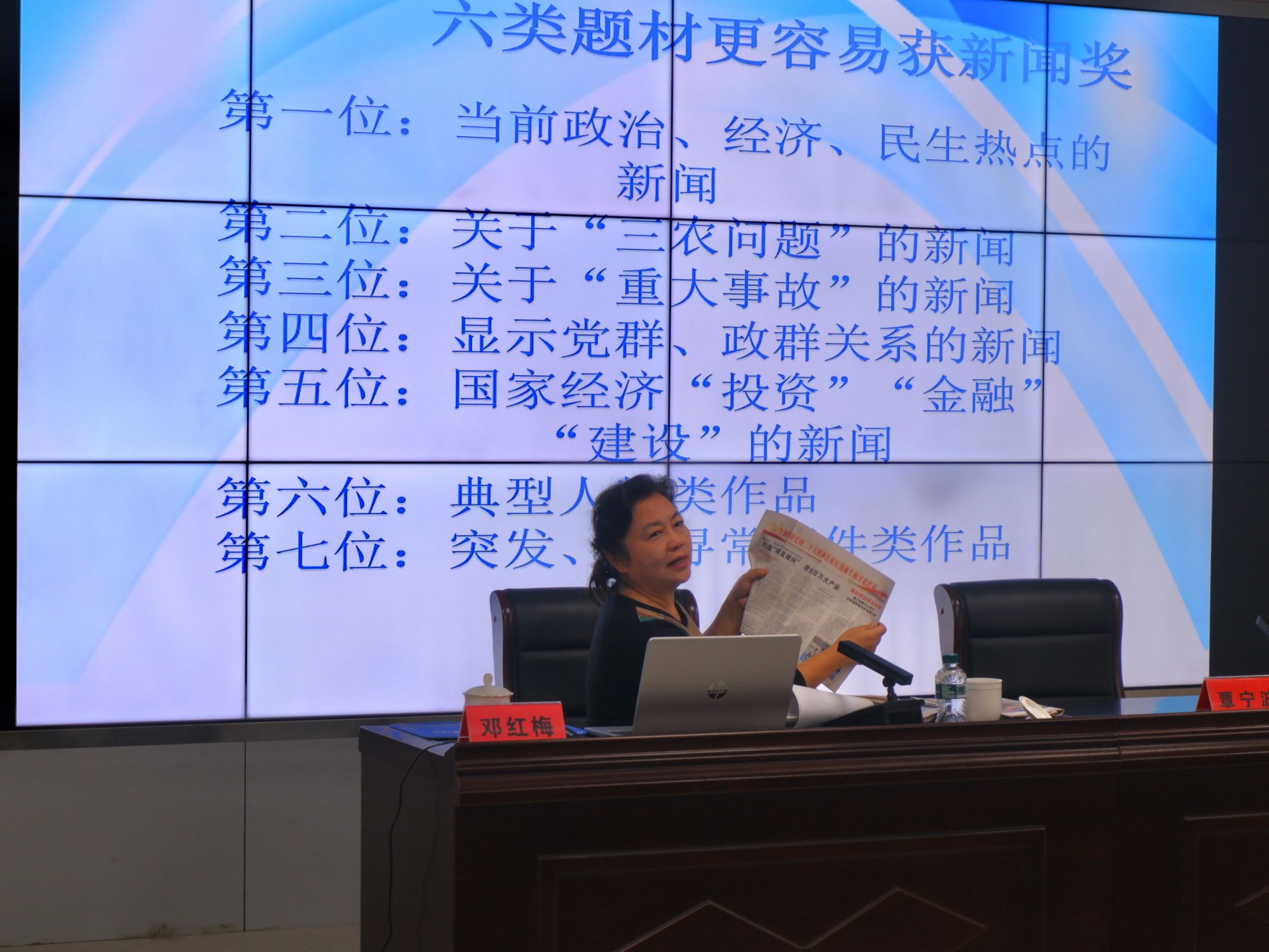 邓红梅老师以“什么样的新闻作品容易获奖”为主题,向大家介绍了“中国新闻奖”和“重庆新闻奖”,“中国新闻奖”是国内新闻界的最高奖项。邓老师通过统计近年来获奖的新闻,讲述了获奖主题的共同点——紧扣时代主题、舆论导向正确、题材重大重要、角度新颖独特、表达多样精彩、呈现创新融合。同时,邓老师称,“写什么比怎么写重要,还讲述了自己与“中国新闻三等奖”失之交臂的事件,表达了新闻选材的重要性。然后邓老师提出了提升新闻奖获奖率必要的“三心”——“养题”的耐心,积累素材的恒心,志在必得的决心,有了这“三心”,就有拿到新闻奖的可能。