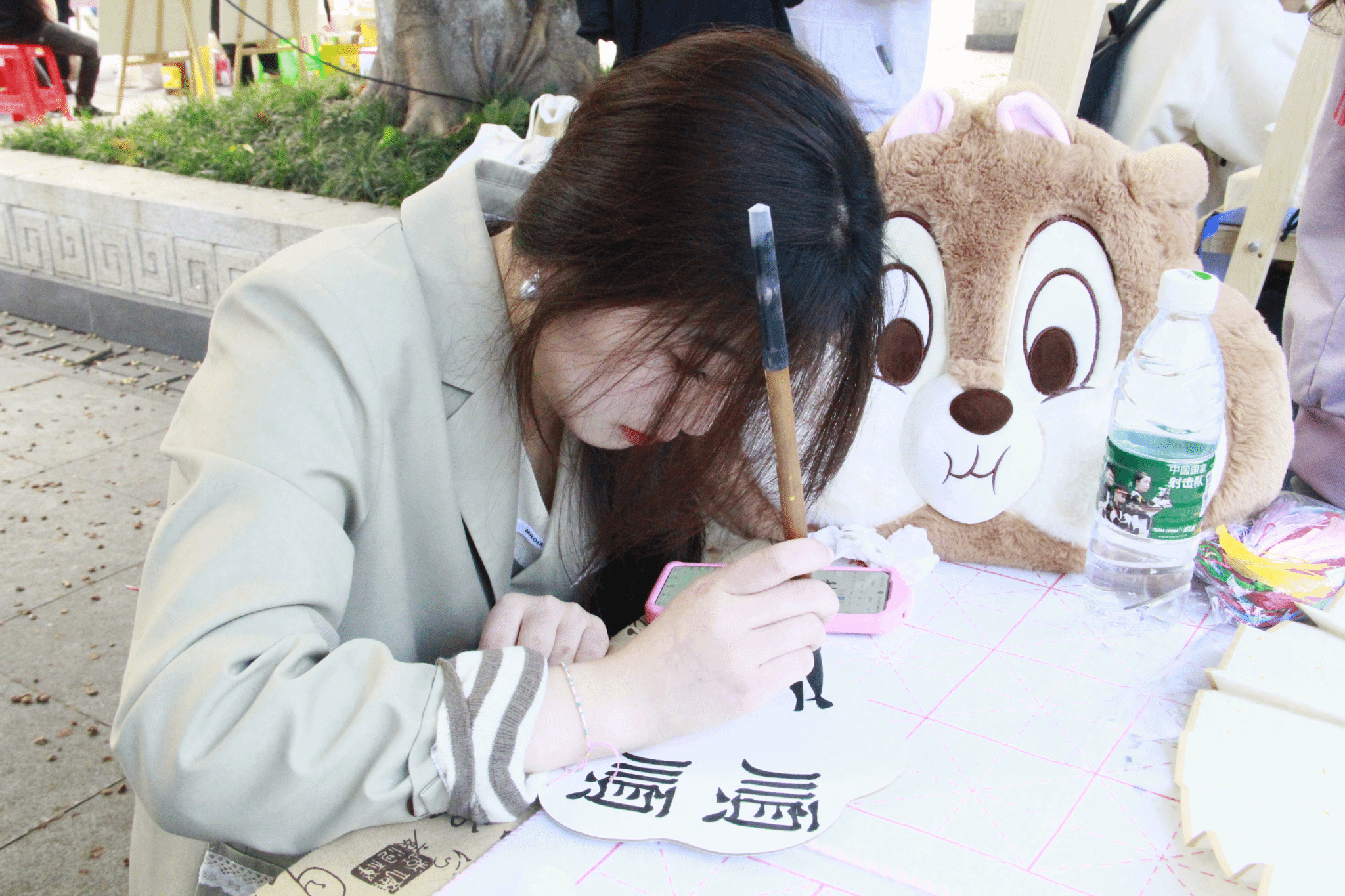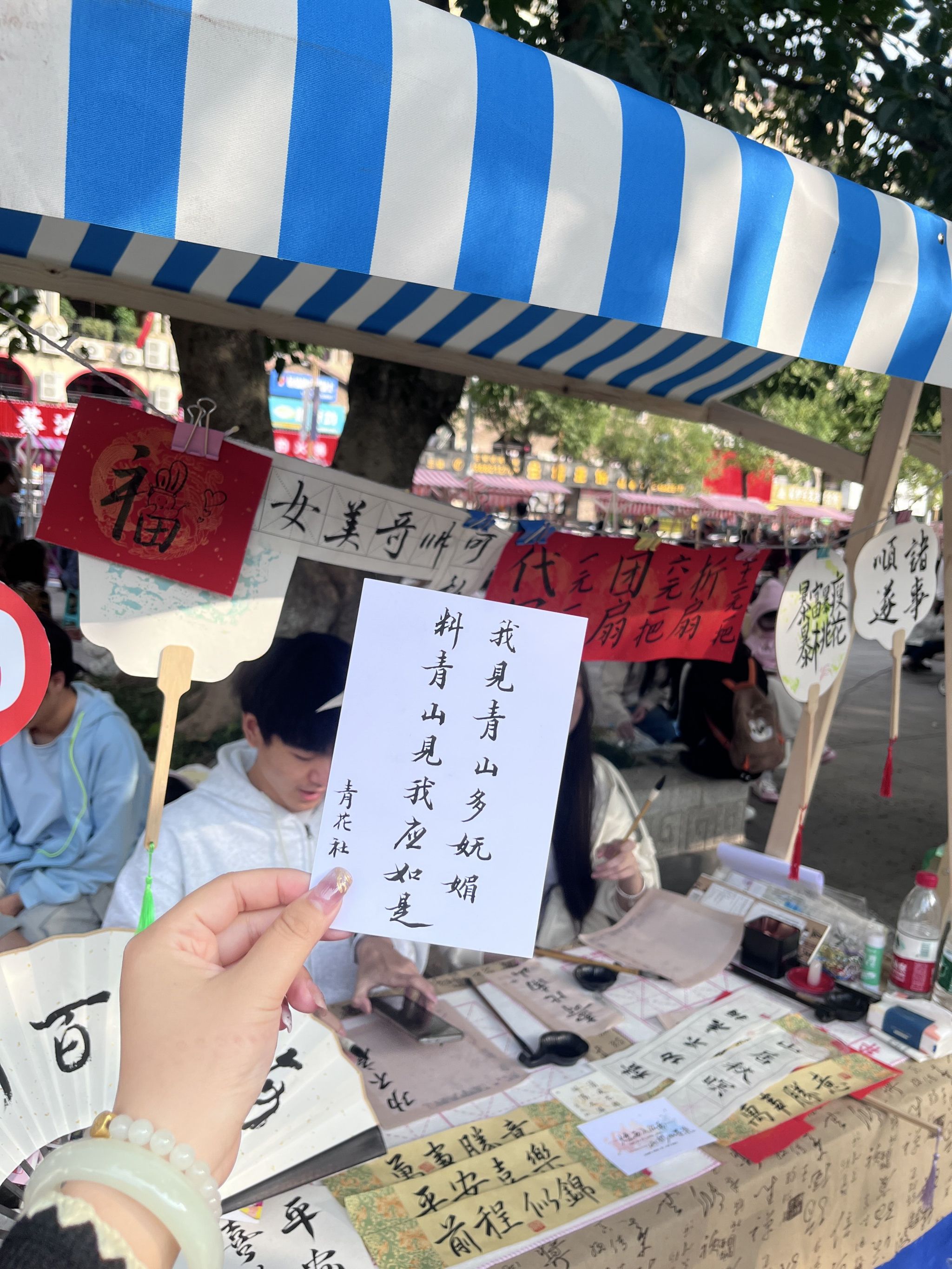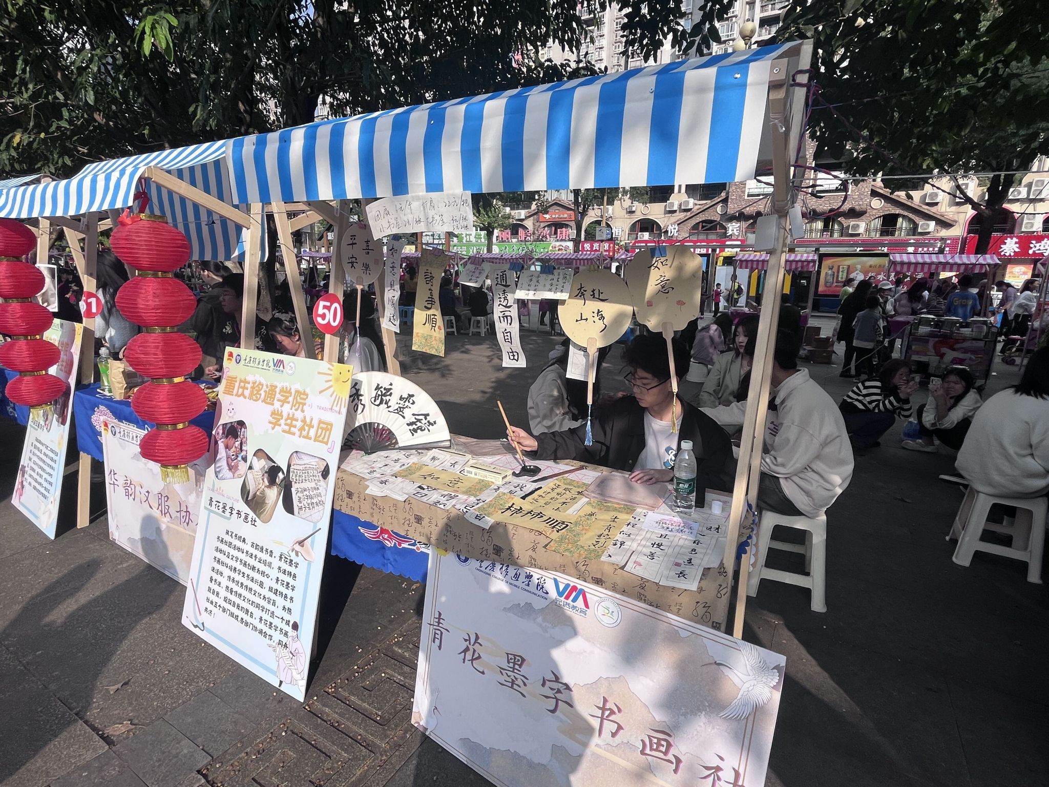 翰墨书香,载悠悠岁月。书法是中国传统文化的精髓之一,具有极高的艺术价值。“青花墨字”书画社秉承弘扬传统文化的理念,结合自身社团开展了团扇、书签制作工艺,通过在书签和扇子上用笔墨书写汉字,表达所蕴含的文学艺术。书画社的同学热情指导,现场教学笔法,大家兴致勃勃地跟着临摹,照猫画虎,力求做到最好。
