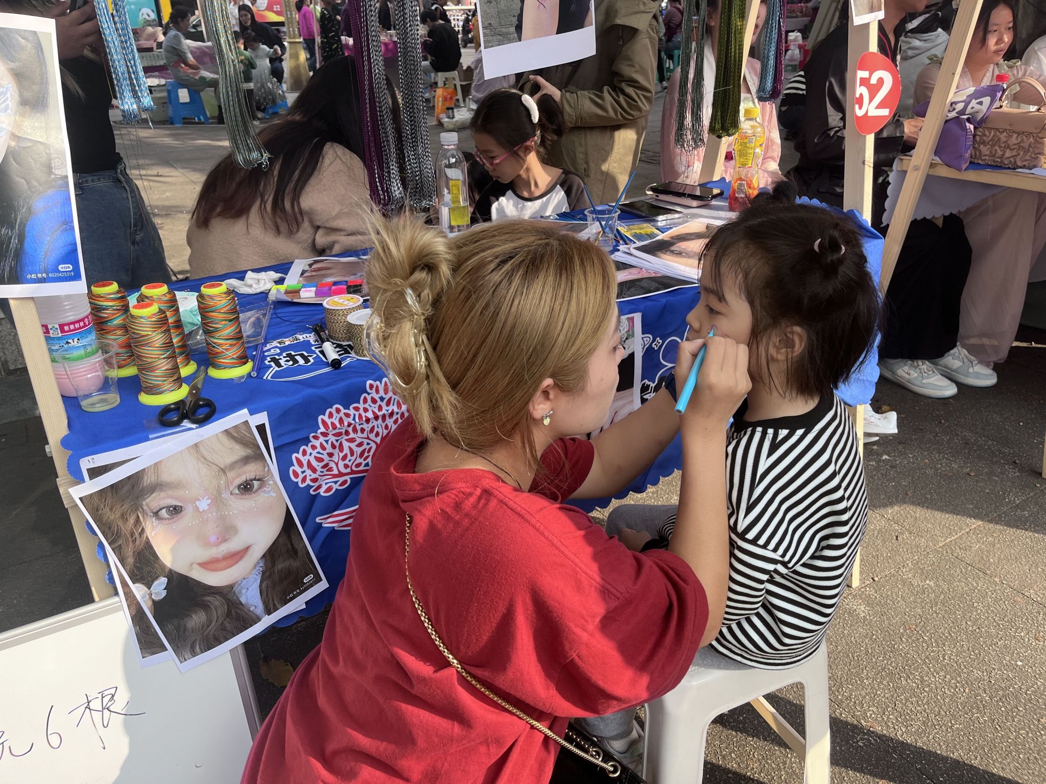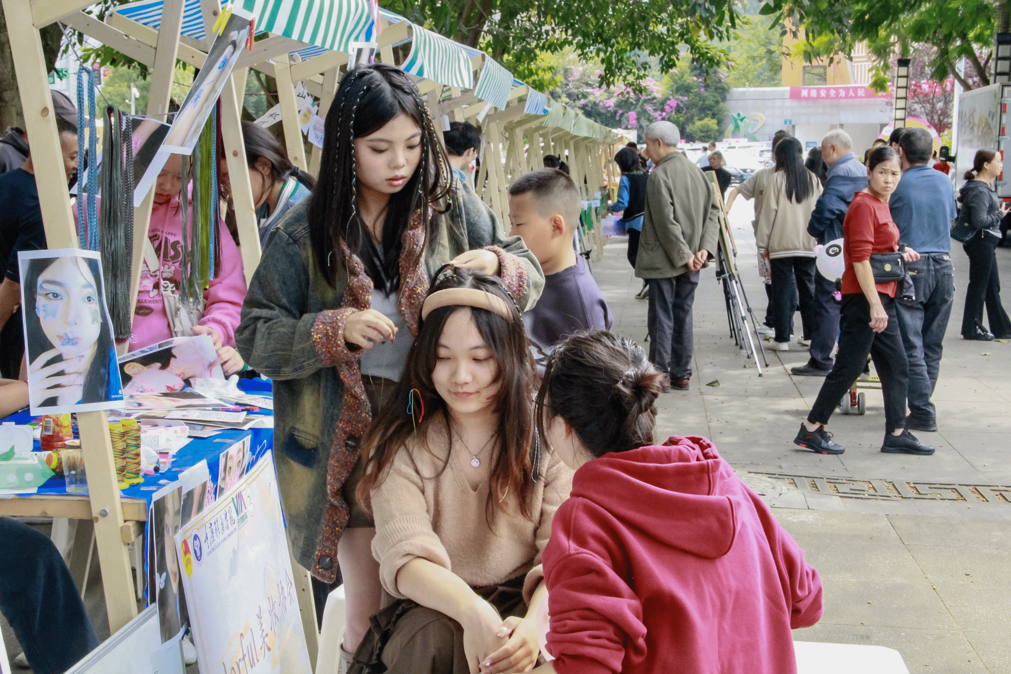 人体艺术彩绘运用鲜艳明亮的色彩在皮肤上勾勒出形状,跳脱常理之下的视觉想象,将平面与三维之间的距离瓦解。炫彩的眼妆、富有活力的编发造型、石膏娃娃彩绘,每一项都是当下流行的艺术活动。Colorful美妆协会招牌一经写出,就吸引无数小孩子和年轻人前来参与,经过网上多巴胺穿搭、泫雅风的火爆,大家似乎对色彩有了更多的认识,不再拘泥于普通的黑白灰搭配,反而颜色越鲜艳,心情越明亮。每个人都在拥抱艺术,做纯粹浪漫的人。
